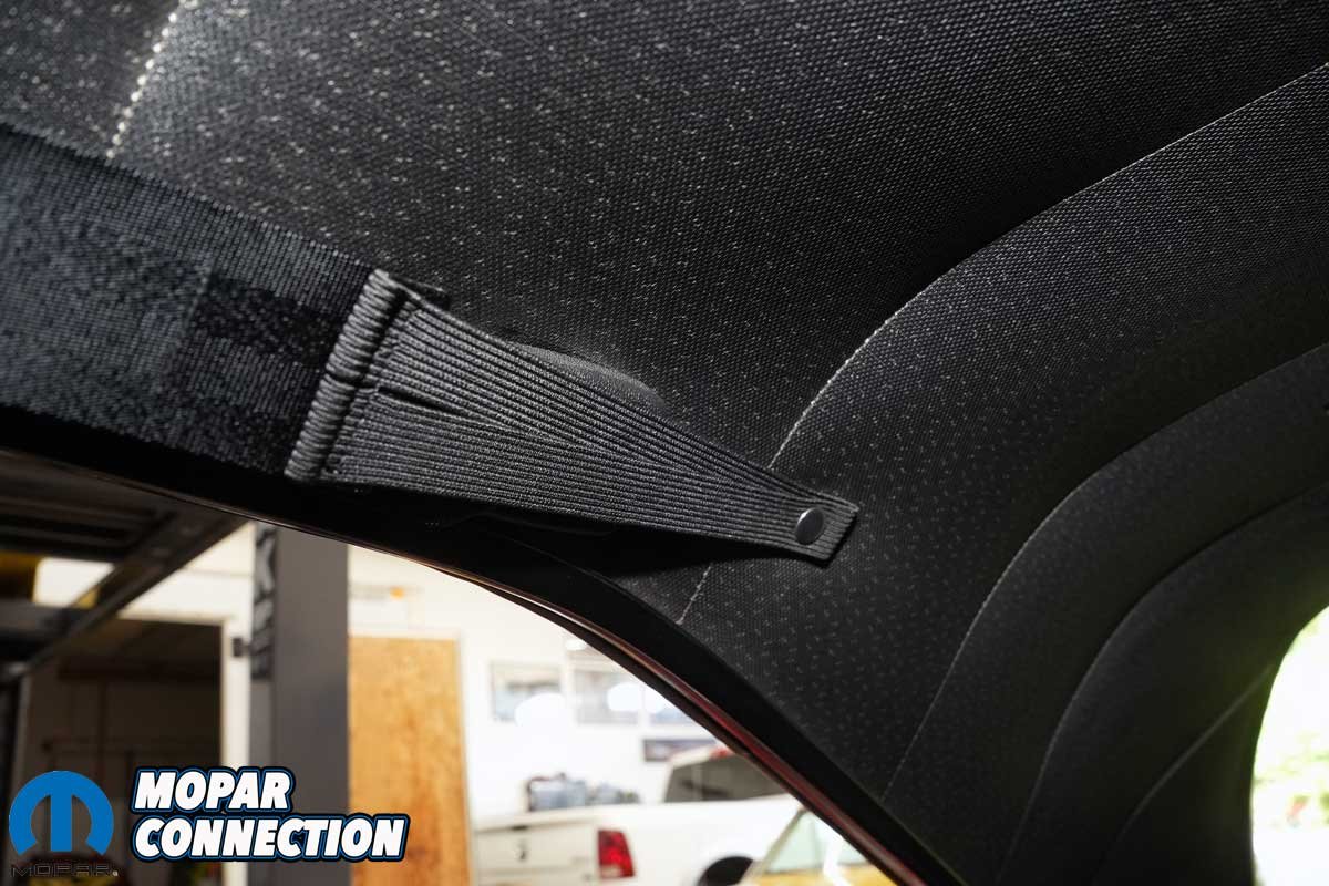 Above Left: On both sash belts, the factory installed an elastic extension to the end of the webbing. It holds the loose belt end from hanging when the belt is stored. However, the elastic is under constant tension, which eventually breaks down its ability to do its job. Above Right: On Amazon, we found 2-inch seat belt keepers that wrap around the belt and Velcro to lock in place, helping support the elastic extension.