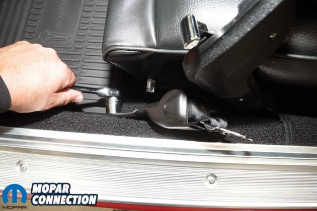 Above Left: We installed the driver’s side ratchet assembly with the factory anchor bolt. Above Right: The passenger’s side assembly was bolted in place with the factory bolt. The ratchet housings are a bit bulky, but they clear every component in their vicinity.