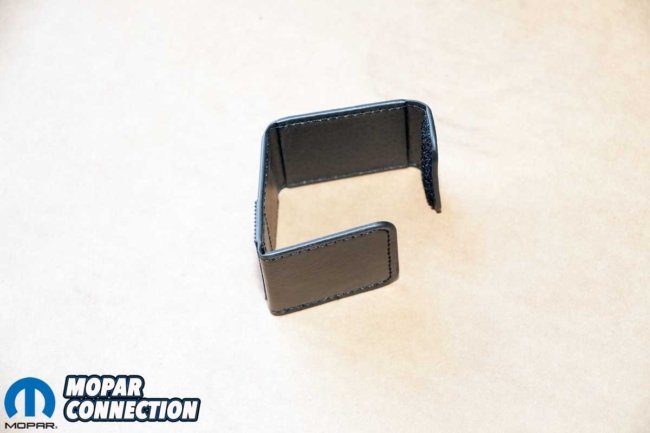 Above Left: On both sash belts, the factory installed an elastic extension to the end of the webbing. It holds the loose belt end from hanging when the belt is stored. However, the elastic is under constant tension, which eventually breaks down its ability to do its job. Above Right: On Amazon, we found 2-inch seat belt keepers that wrap around the belt and Velcro to lock in place, helping support the elastic extension.