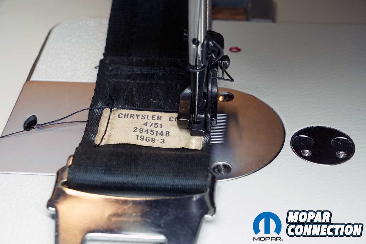 Included with our restored belts was the replacement tag for the rear seat belt. Installing it required pulling the rear seat bottom to access the belt anchor. At our sewing machine, we carefully removed the remnants of the original tag and detached the new tag from the donor belt section. After setting up our Consew sewing machine to replicate the factory stitch length, we sewed the tag onto the belt in its original factory location.