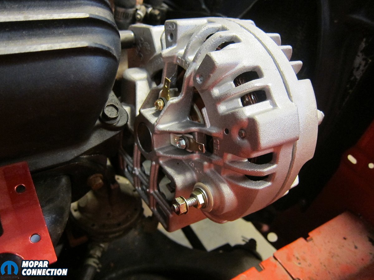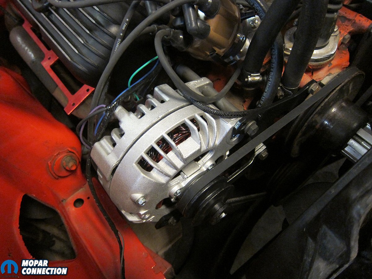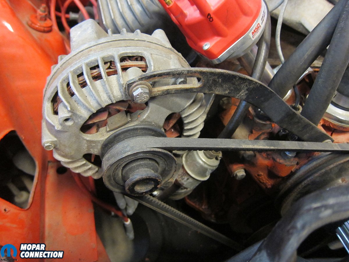 Since the Road Runner’s original round-back was looking plenty tired, we went ahead and made the switch to square. Again, the YearOne harness was a life-saver as the correct triangular plug for the electronic regulator was already built in, eliminating the need for any splices. The bird’s original alternator brackets had gone missing over the years and were somehow replaced by those off of a ’67-’68 big block with air conditioning. Another look through the YearOne catalog netted a proper bracket kit (P/N RQ89) to replicate the factory 1969-up non-A/C mounting position.