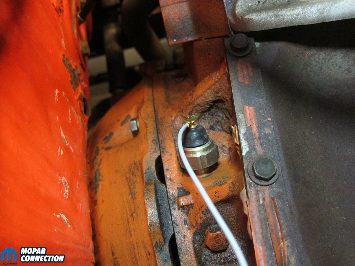 Surprisingly enough, the non-functioning factory oil pressure warning light was pretty much the exact same situation. The sending unit had been removed to make way for the under-dash mechanical gauge’s feed tube. We simply screwed the tube fitting out, replaced it with a sending unit, and had a working factory warning light. Since standard, non-Rallye dashes have an oil pressure warning light, their sending unit is different from that of a Rallye panel with an actual gauge. For quick visual verification, the warning light sending unit is a stubby unit while the gauge sending unit is a canister that is about two-inches tall.