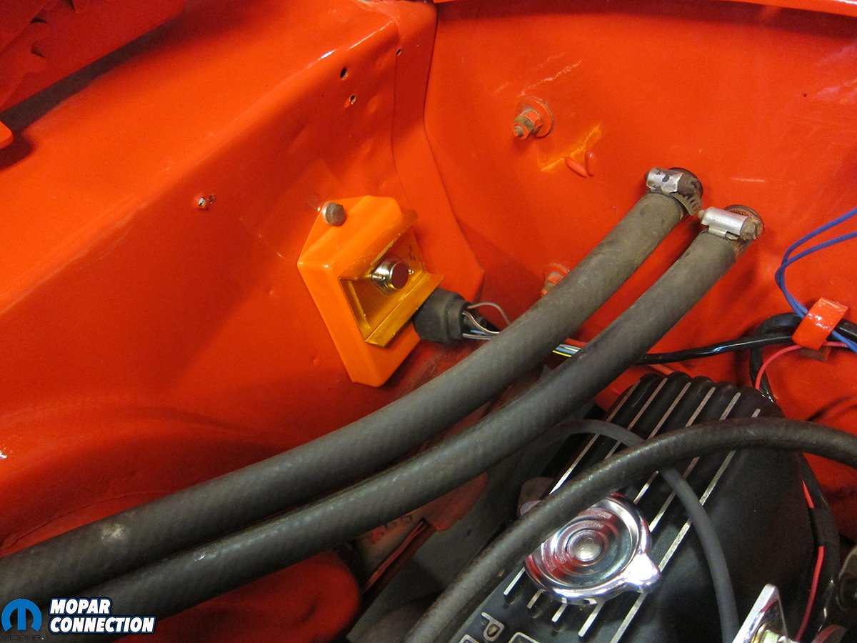 The final piece of the ignition system revamp was a Mancini Racing coil relocation bracket (P/N MRE1064). A Holley carburetor’s front fuel bowl generally makes it difficult to mount a coil in the factory location and some aftermarket aluminum intakes don’t even have provisions for mounting. The Roadrunner’s coil bracket had been bent to fit and was barely hanging on by a single bolt, amounting to quite the eyesore.