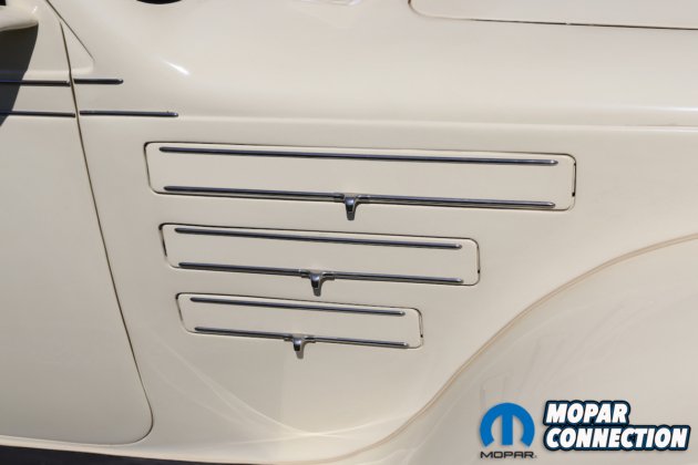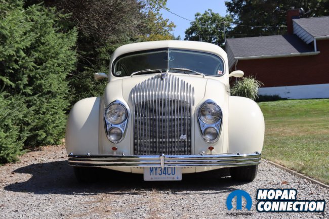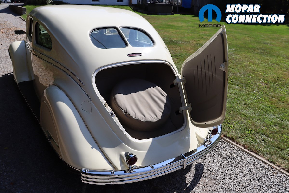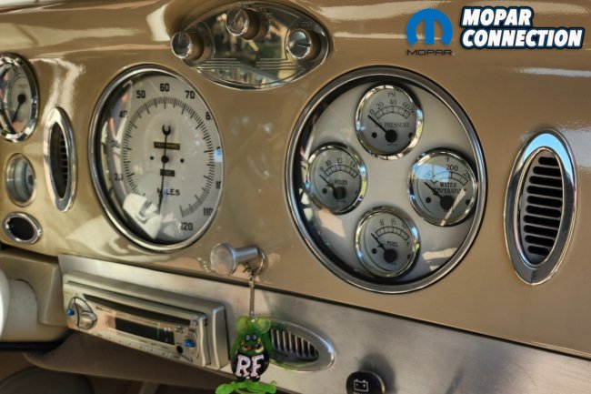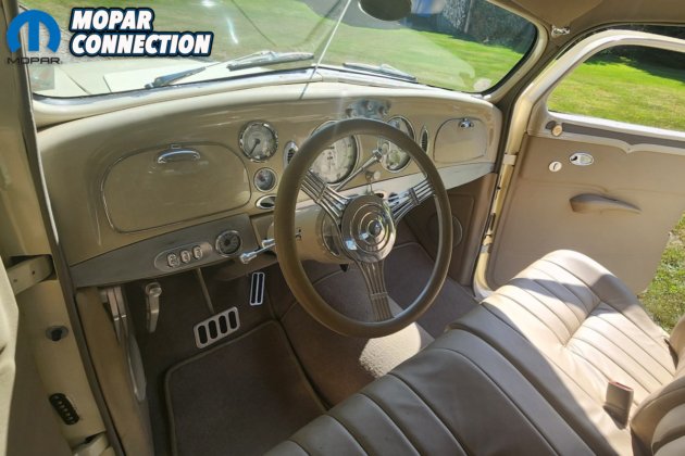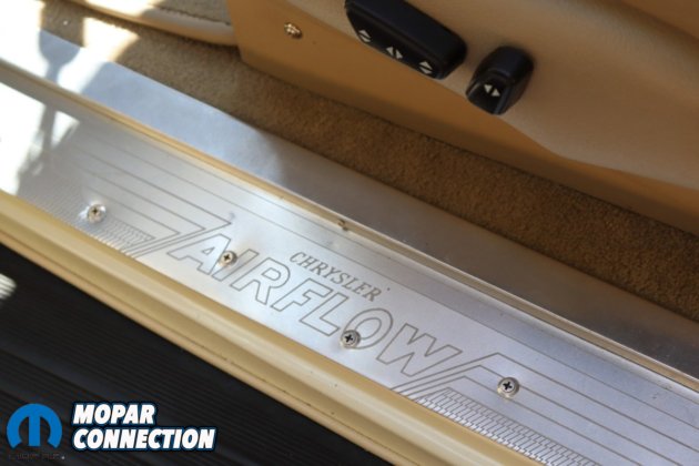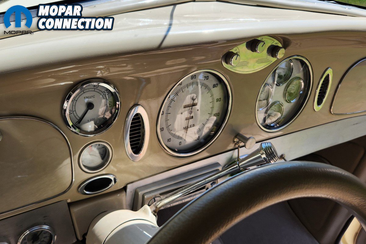 The instruments on the dashboard are modern but still have a period-correct look. The two large gauges consist of a speedometer and a four-cluster pack of gauges that have oil pressure, voltage, water temperature, and fuel. On the left side above the tilt steering column, you will find the tachometer gauge. Between the larger gauges you will find the climate controls. The Airflow has an automatic shifter on the steering column with a banjo-style steering wheel. Custom levers for air bag control are located on the left under the dashboard.