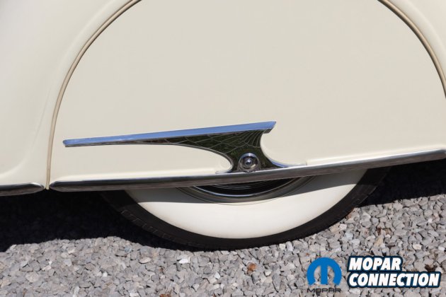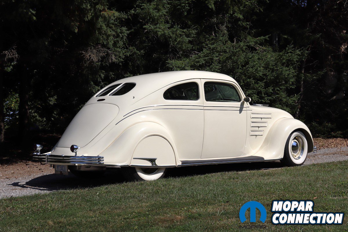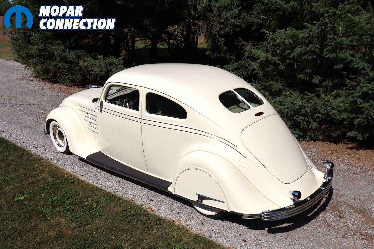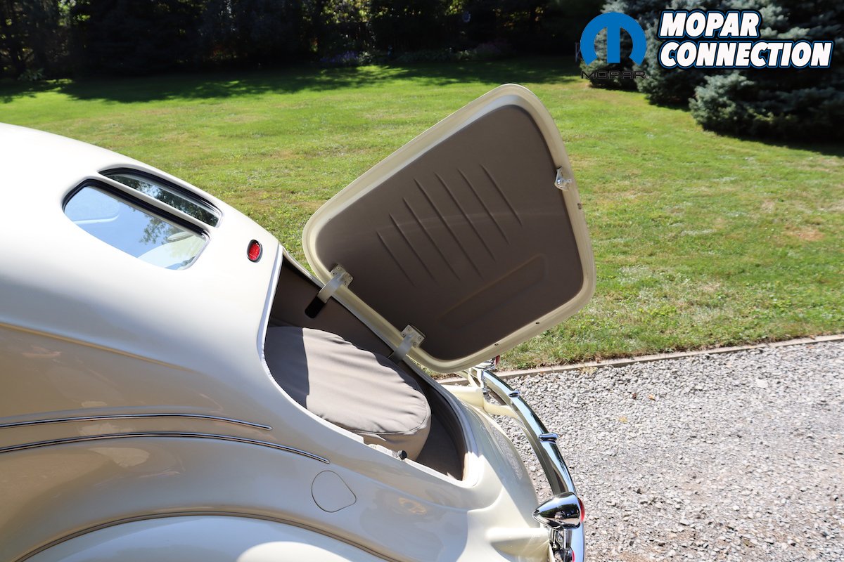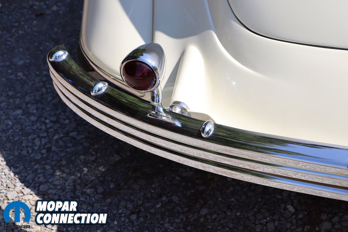 The instruments on the dashboard are modern but still have a period-correct look. The two large gauges consist of a speedometer and a four-cluster pack of gauges that have oil pressure, voltage, water temperature, and fuel. On the left side above the tilt steering column, you will find the tachometer gauge. Between the larger gauges you will find the climate controls. The Airflow has an automatic shifter on the steering column with a banjo-style steering wheel. Custom levers for air bag control are located on the left under the dashboard.