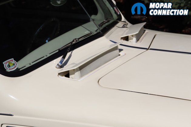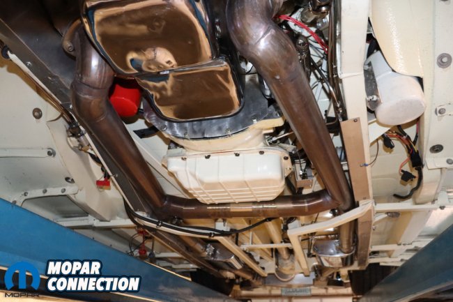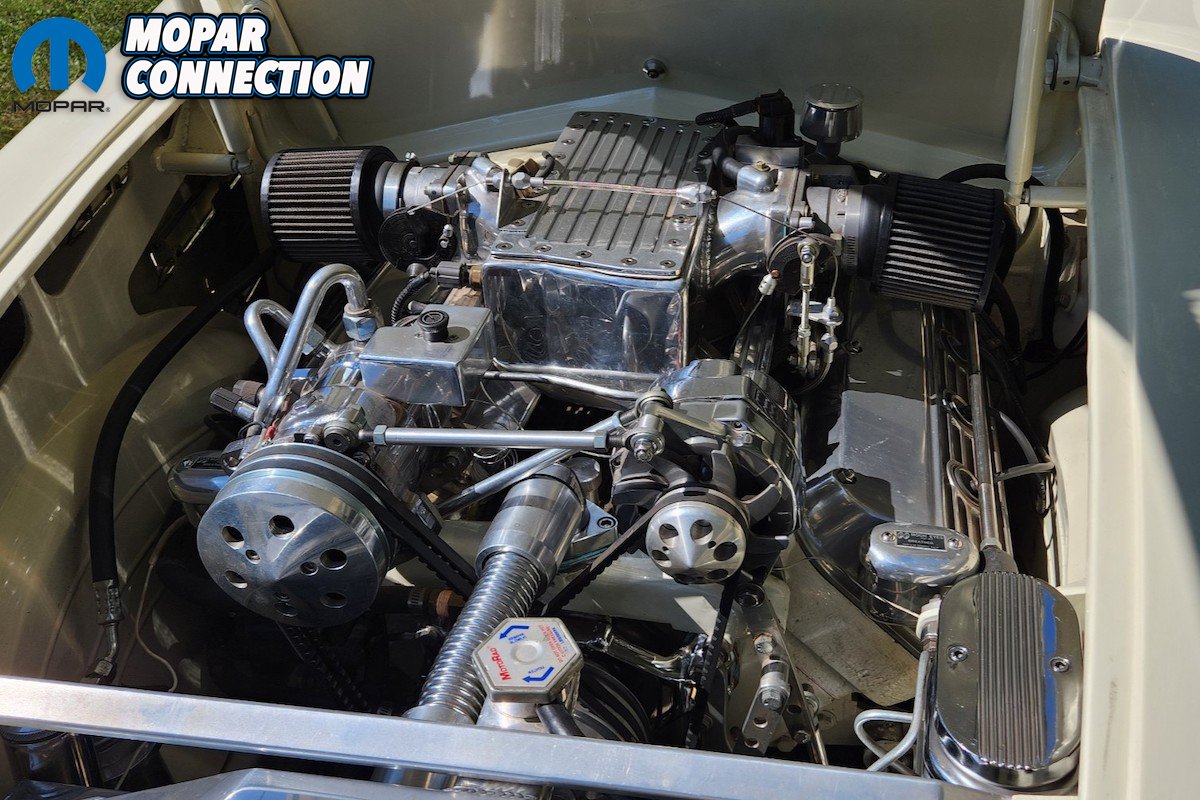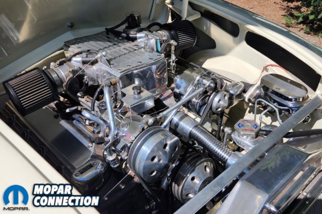 The engine selected would be a 1958 392 cubic inch Hemi. The engine received ported stock heads with, believe it or not, handmade electronic fuel injection by Robert himself. The cam was reground to 1958 Chrysler 300 specifications. Robert uses a twin 90 mm throttle body with an aluminum intake with custom fuel rails. Moon Valley pan was also added, and for bling, aluminum pulleys and brackets with matching valve covers and breathers.