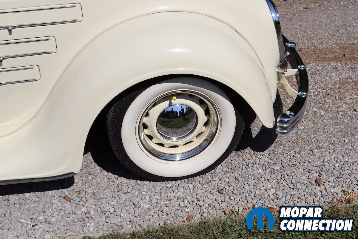 Artillery wheels, Moon caps, and chrome trim rings give the car a timeless, classic look, while those wide whitewalls really complete the vintage aesthetic. The staggered rim sizes—15 x 7 in the front and 15 x 9 in the rear—also suggest a well-thought-out stance for the build. Robert chose Diamond Back Classic tires with wide whitewalls to maintain a period-correct vibe while benefiting from modern radial construction—smooth ride, dependable grip, and no sacrifice to retro appeal. Radial construction ensures a smooth ride.