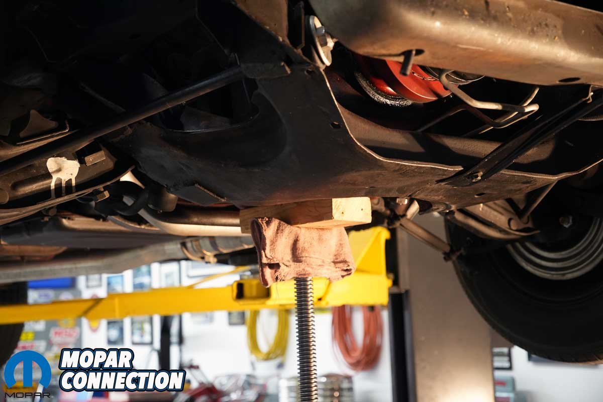 Above Left: Once the isolator nuts and washers were removed, we used a screw jack to raise the engine from the K-member. Above Right: We used a block of wood between the screw jack and the oil pan. The wood provided an increased flat surface area, so the oil pan would not be dented or damaged.