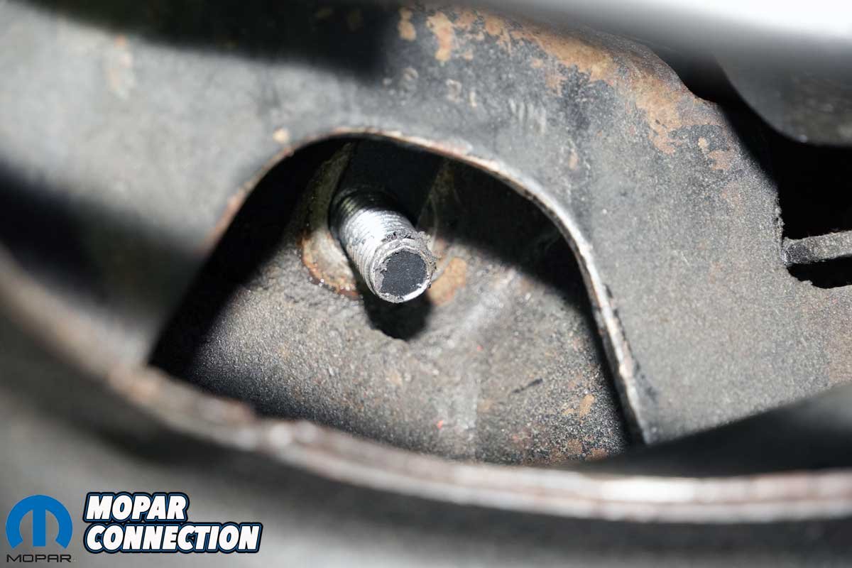 We raised the Dart on our car lift to install the new mounts. A floor jack and a pair of jack stands would do the job if a lift was unavailable. With the Dart secured on the lift, we removed a ¾-inch nut and washer from each engine mount. Upon unthreading the nut and washer on the passenger’s side, we noticed the slot in the K-member in which the isolator stud slips through was oblong, as though someone had opened it up with a die grinder.