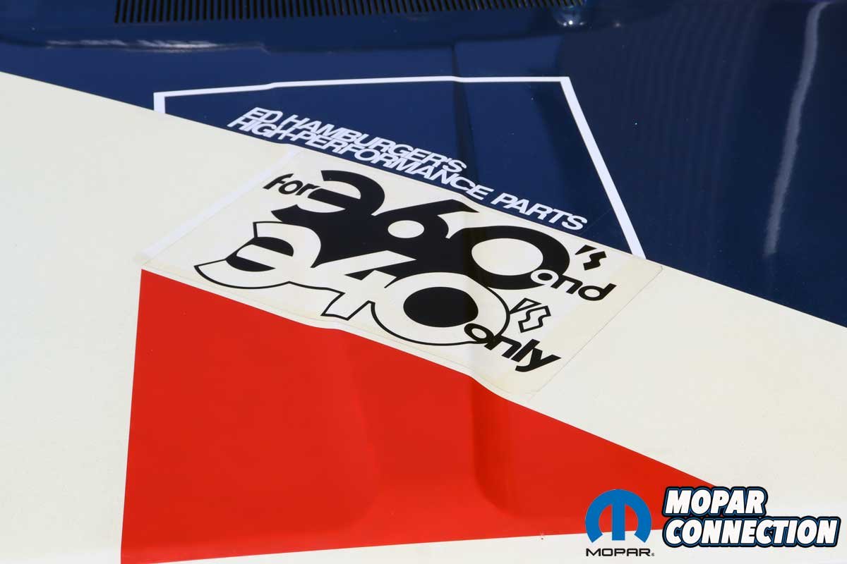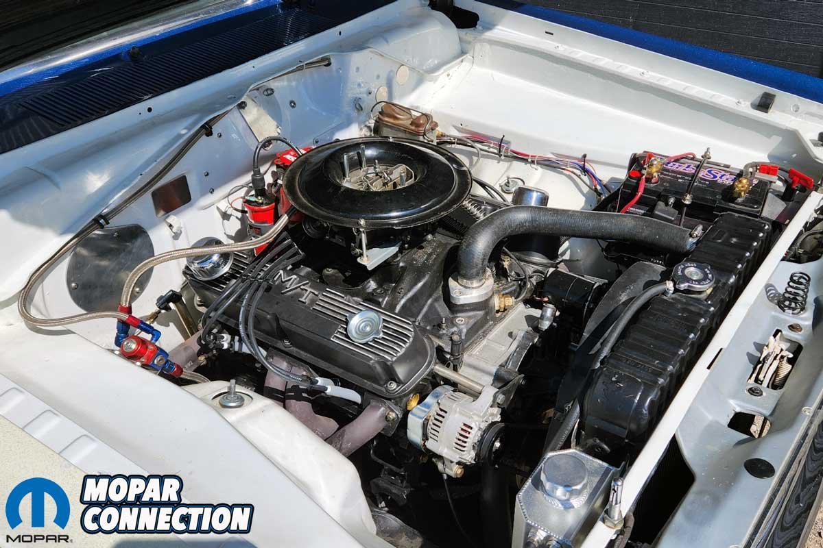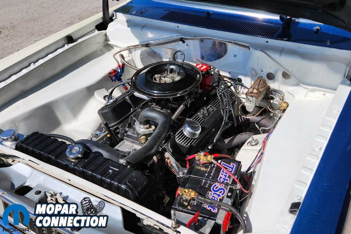 The Duster still runs its original 340, which remains legal for NHRA Stock with only minor modifications, including blueprinting, balancing, and a camshaft upgrade within spec. It features a Carter Thermoquad carburetor, Hooker Competition headers with adjustable collectors, aftermarket valve covers, and an MSD ignition for consistent spark at high rpm.