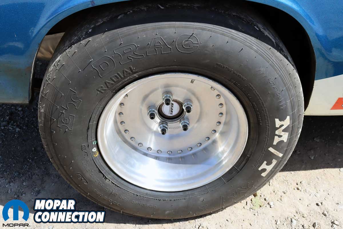 Body modifications were minimal, consisting only of minor trimming to accommodate 30-inch slicks. The car rides on Centerline wheels with Moroso front drag tires and M/T rear drag radials. The metallic blue finish is accented with white striping, while its patina of race wear tells the story of decades spent at the strip.