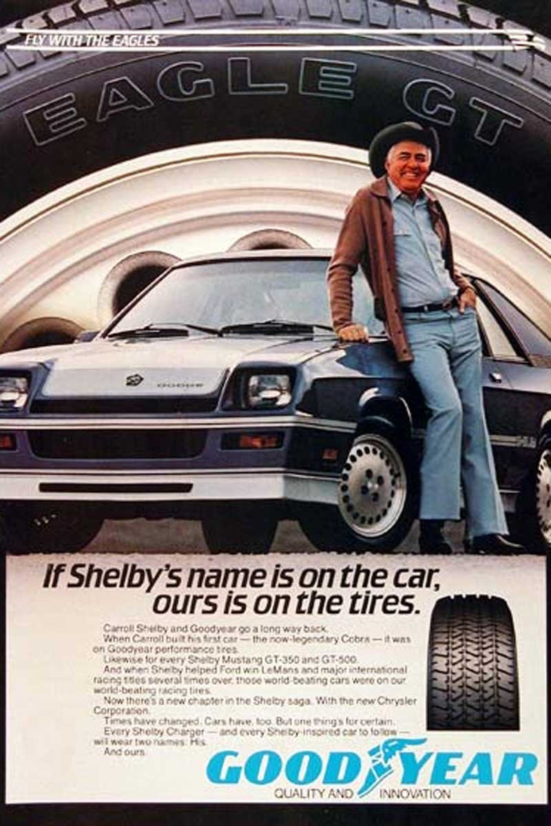 As depicted in the Goodyear advertisement, Shelby relied on Goodyear tires from his original Cobras to the Direct Connection Mopars. Goodyear radial tires for a Shelby Mopar can be sourced from multiple local outlets, and for those looking for Goodyear Polyglas tires, check out Classic Industries.