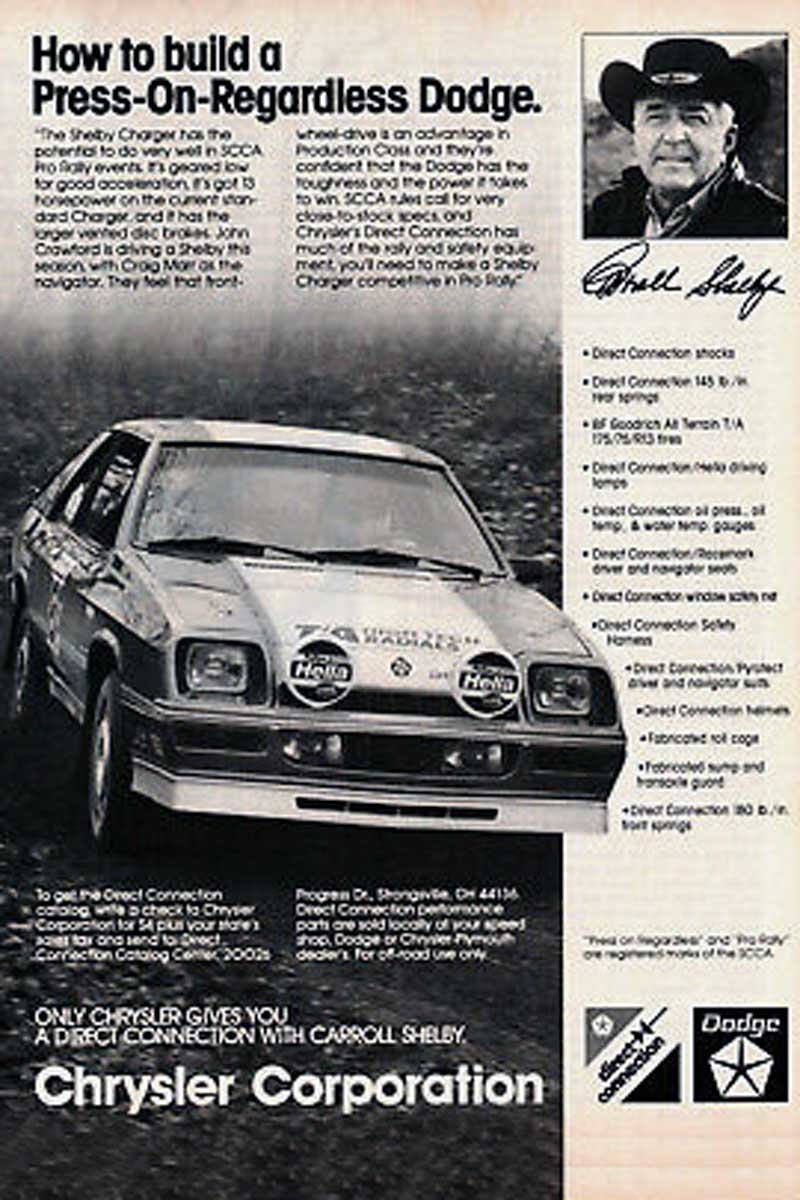 Above Left: Goodyear celebrated the Shelby and Chrysler union with an advertisement discussing the use of Goodyear tires. Shelby always had great success with Goodyear since his involvement with them on his original Cobras. Above Right: Chrysler Corporation’s Direct Connection also advertised its partnership with Shelby.