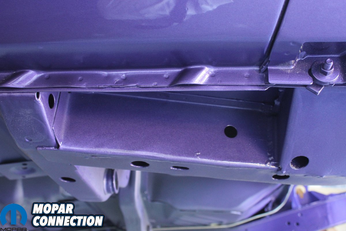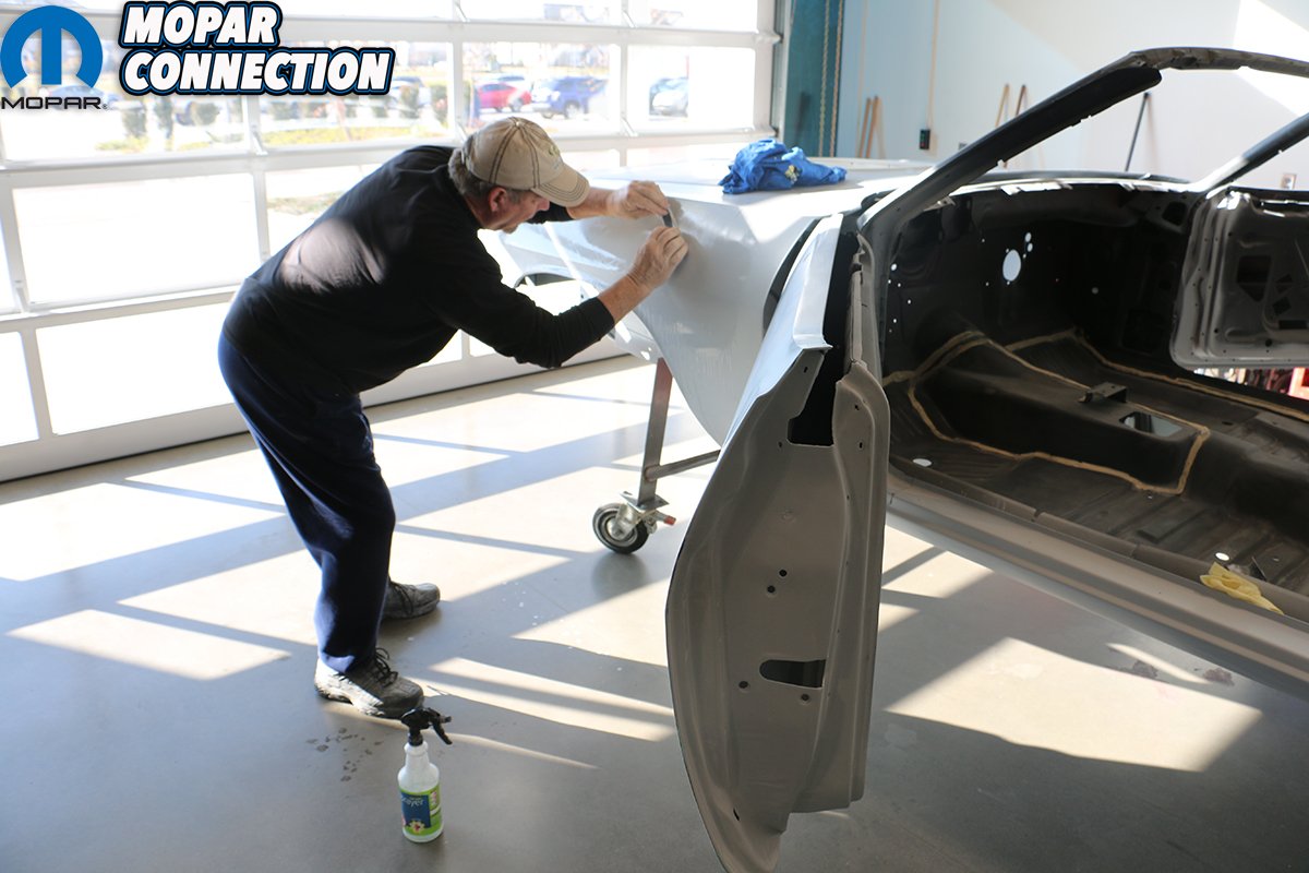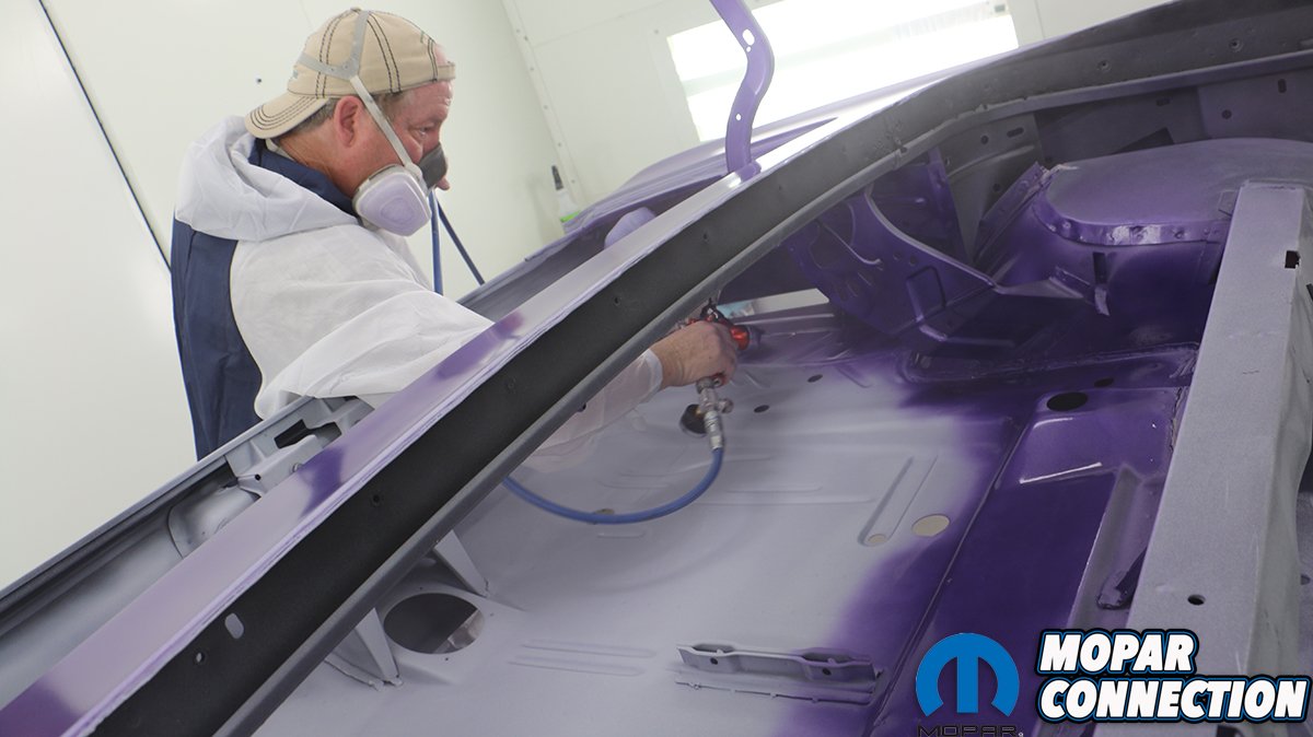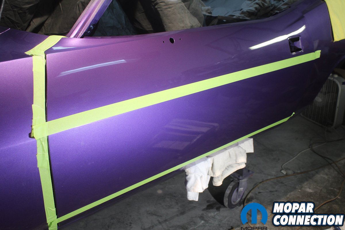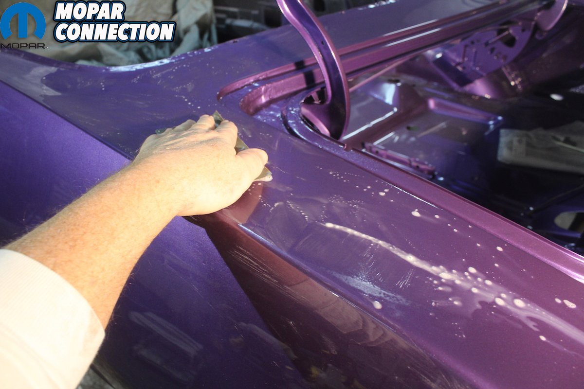 Even after spending all day Friday prepping the Comeback ‘Cuda for paint, we still went over the car with a fine toothed comb early Saturday morning. Clean, clean, and more cleaning. By rolling the car into the natural morning light any minor flaws were suddenly much easier to find. We went over the car looking for and marking any tiny flaws or pin holes in the primer. While we used some body glaze to repair the flaws, we completely went over every inch of the car with a grey scuff pad, air gun, and a microfiber rag. You need to pay special attention to door jambs, and lower panels of the car. We blew out the frame rails at least six times and each time making sure to get all tiny particles out and off of the car.