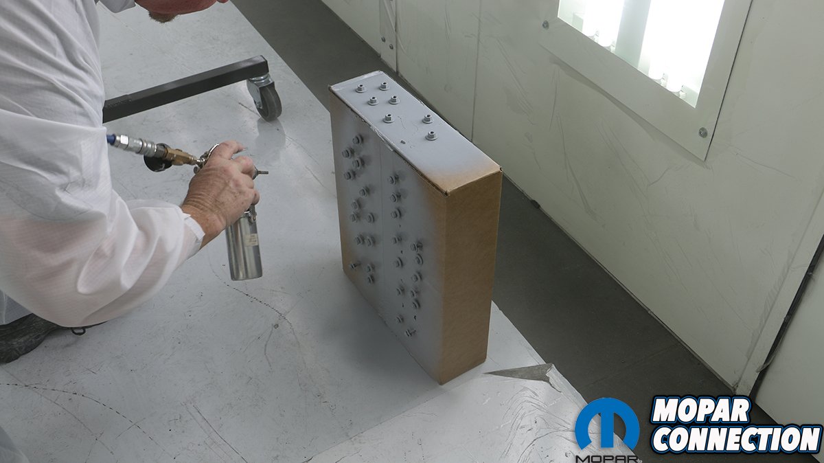 Above left: After turning on the down draft booth we blew the car off one more time. We followed that by using a tack cloth over the entire car. As we began shooting the sealer we noticed that this stuff really goes on great and lays down nice. That is important since we do not need to re-sand before shooting the base coat. Other sealers we have used in the past have gone on grainy and had to be sanded. Above center: Taking the time to shoot every part of the car especially the hard to get to places. By shooting through the open wheel wells you can hit the front of the door frame and the hinges from this side. We also made sure to hit the frame rails and inner fender panels. Above right: Punching holes in a cardboard box and then mounting the already black phosphate-plated bolts and nuts allowed us to paint them with body color and clear. Then after assembly any damage can easily be touched up with a brush. We used a touch up gun to minimize the paint used on small areas.