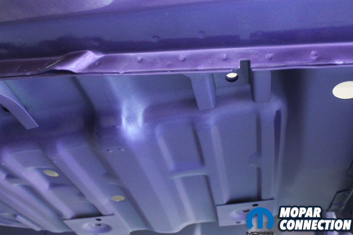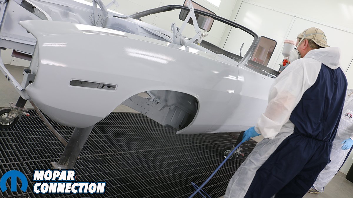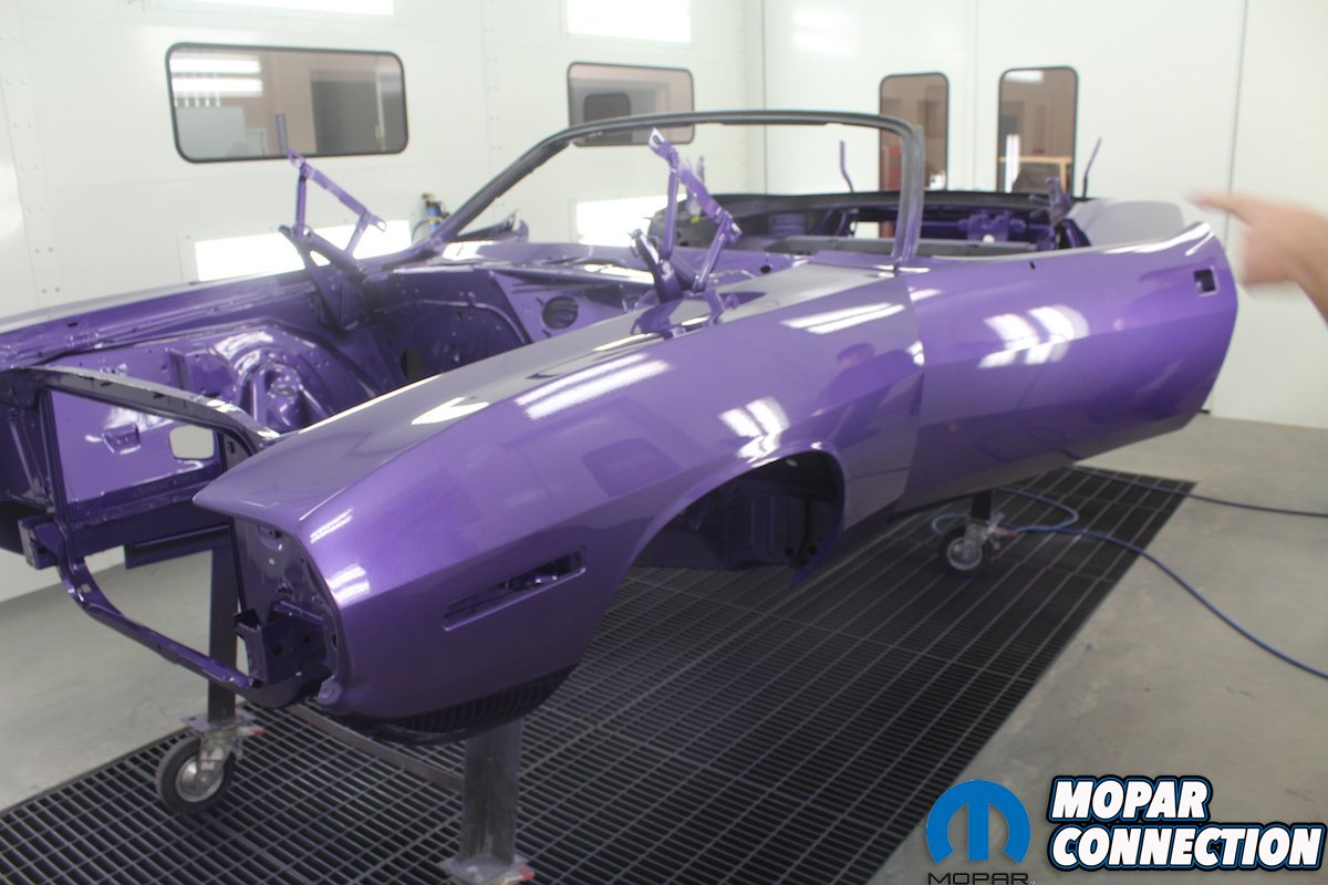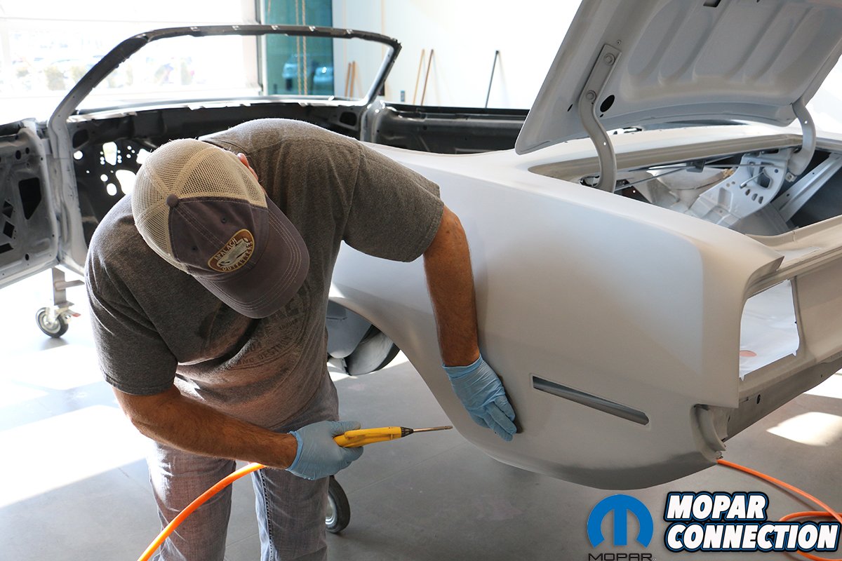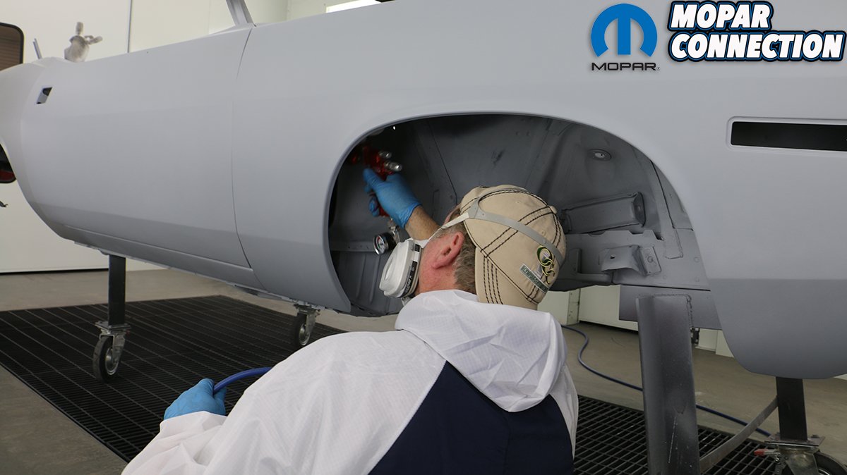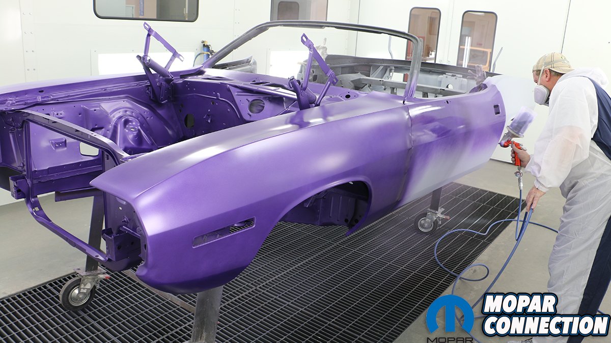 You need to have a plan for shooting the entire car before you start. Try to avoid a dry edge and always overlap to get a uniform, even pattern. When shooting a metallic paint, the gun needs to be farther away from the surface so that the metallic particles will come out uniformly. Since we are wanting to achieve the correct factory appearance, we sprayed a pattern of overspray on the dip primer-painted undercarriage. The trunk is especially difficult to shoot. If the Comeback ‘Cuda was a hardtop, we probably would have painted it first, let it cure and then masked it off. Even then it is difficult to get everything even without dry spots. Being a convertible, the trunk is much easier to access.