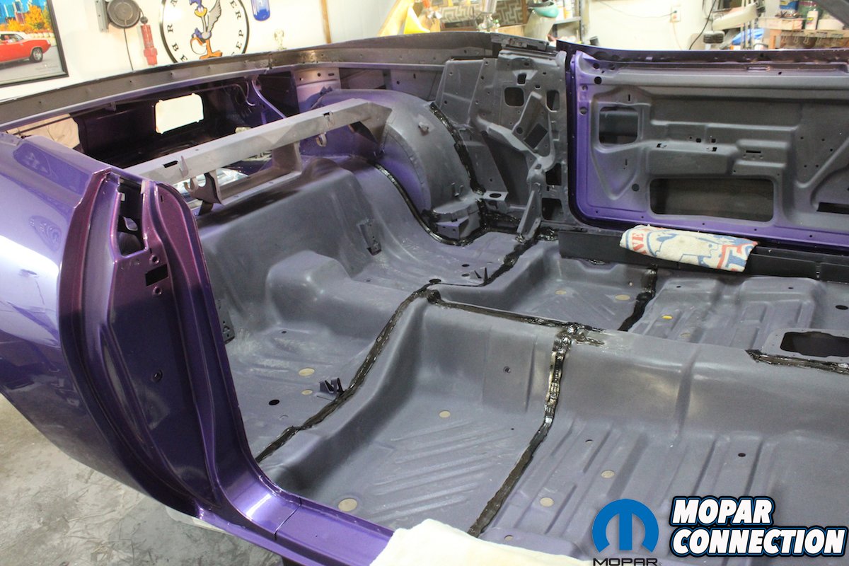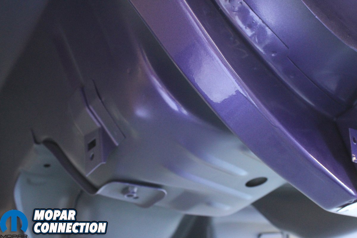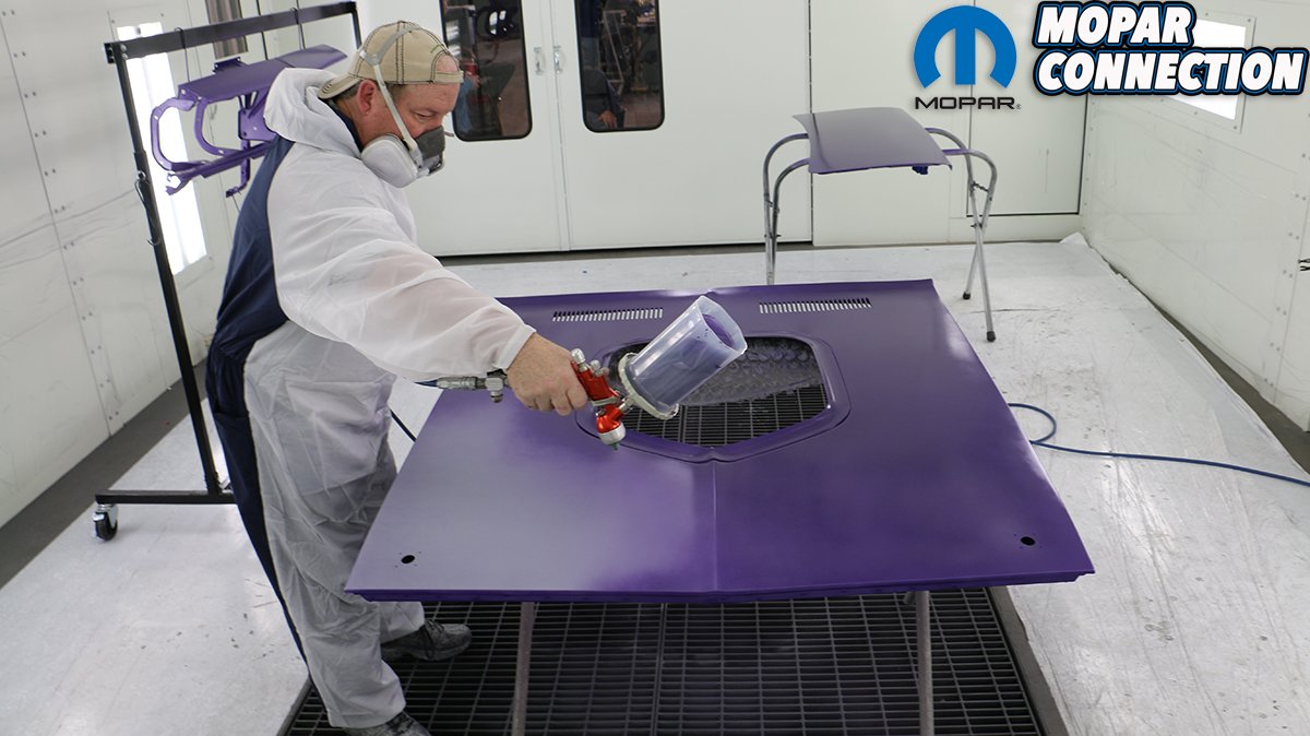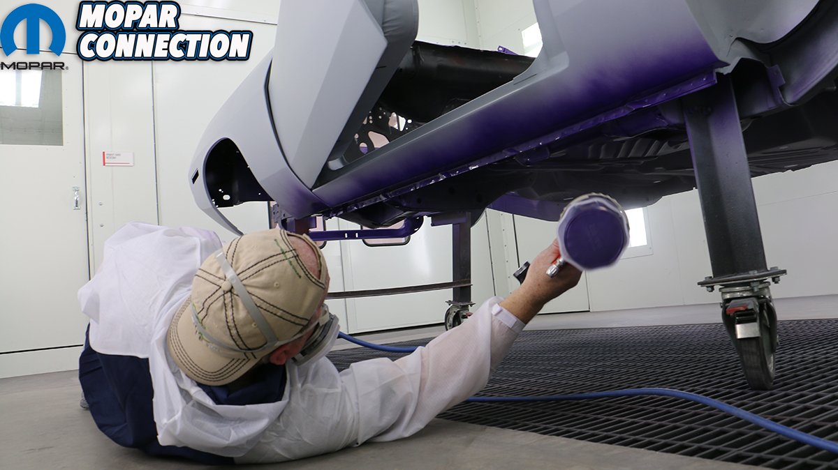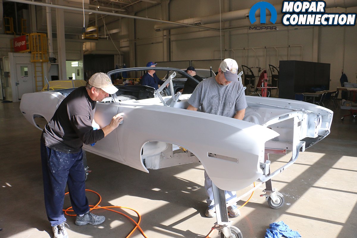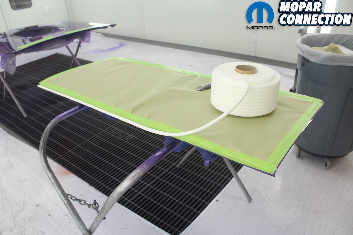 You need to have a plan for shooting the entire car before you start. Try to avoid a dry edge and always overlap to get a uniform, even pattern. When shooting a metallic paint, the gun needs to be farther away from the surface so that the metallic particles will come out uniformly. Since we are wanting to achieve the correct factory appearance, we sprayed a pattern of overspray on the dip primer-painted undercarriage. The trunk is especially difficult to shoot. If the Comeback ‘Cuda was a hardtop, we probably would have painted it first, let it cure and then masked it off. Even then it is difficult to get everything even without dry spots. Being a convertible, the trunk is much easier to access.