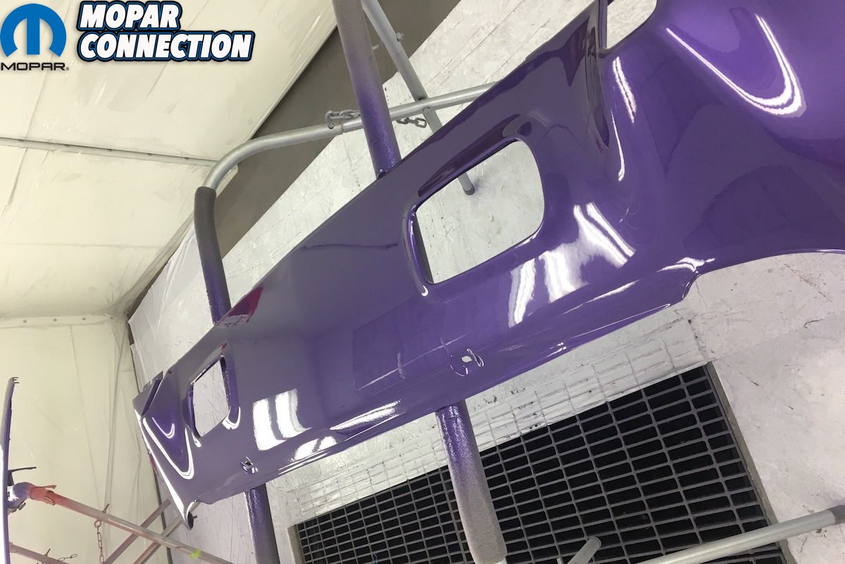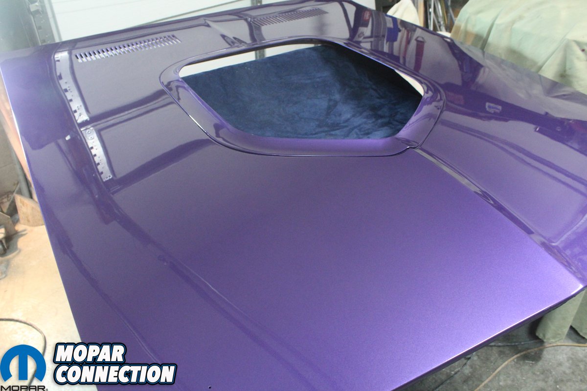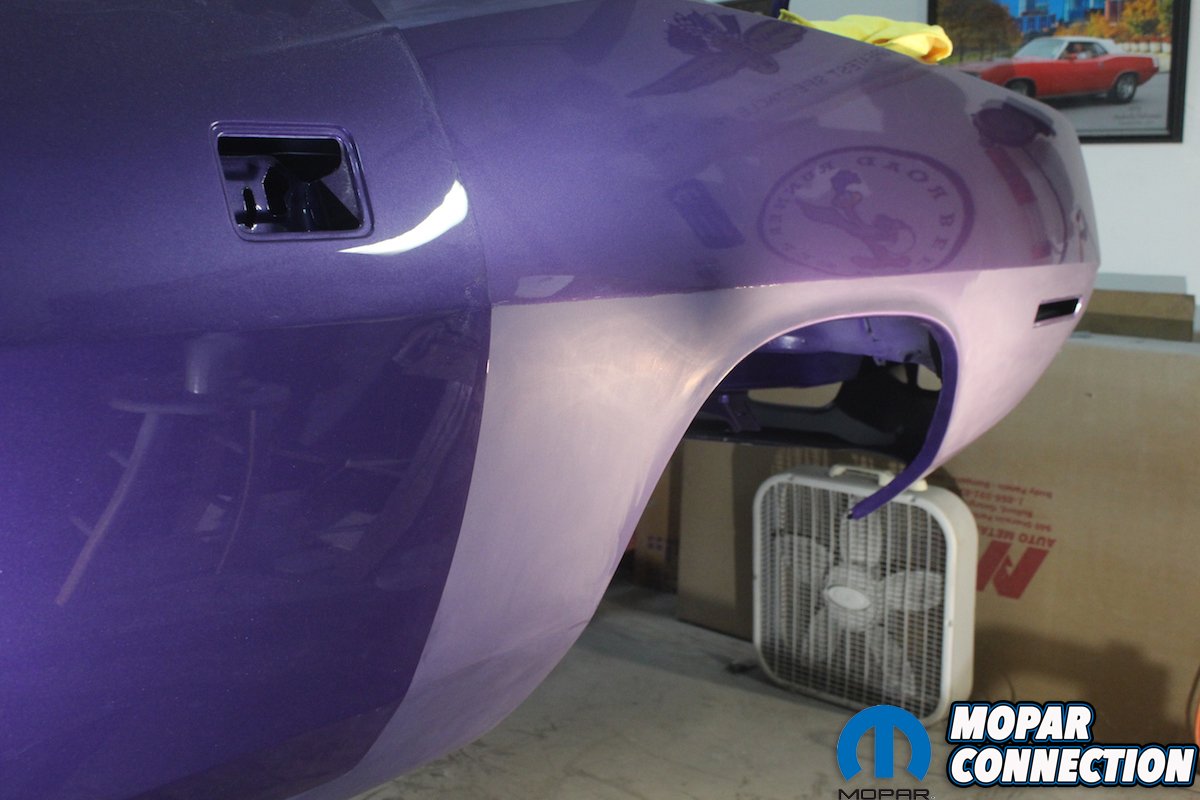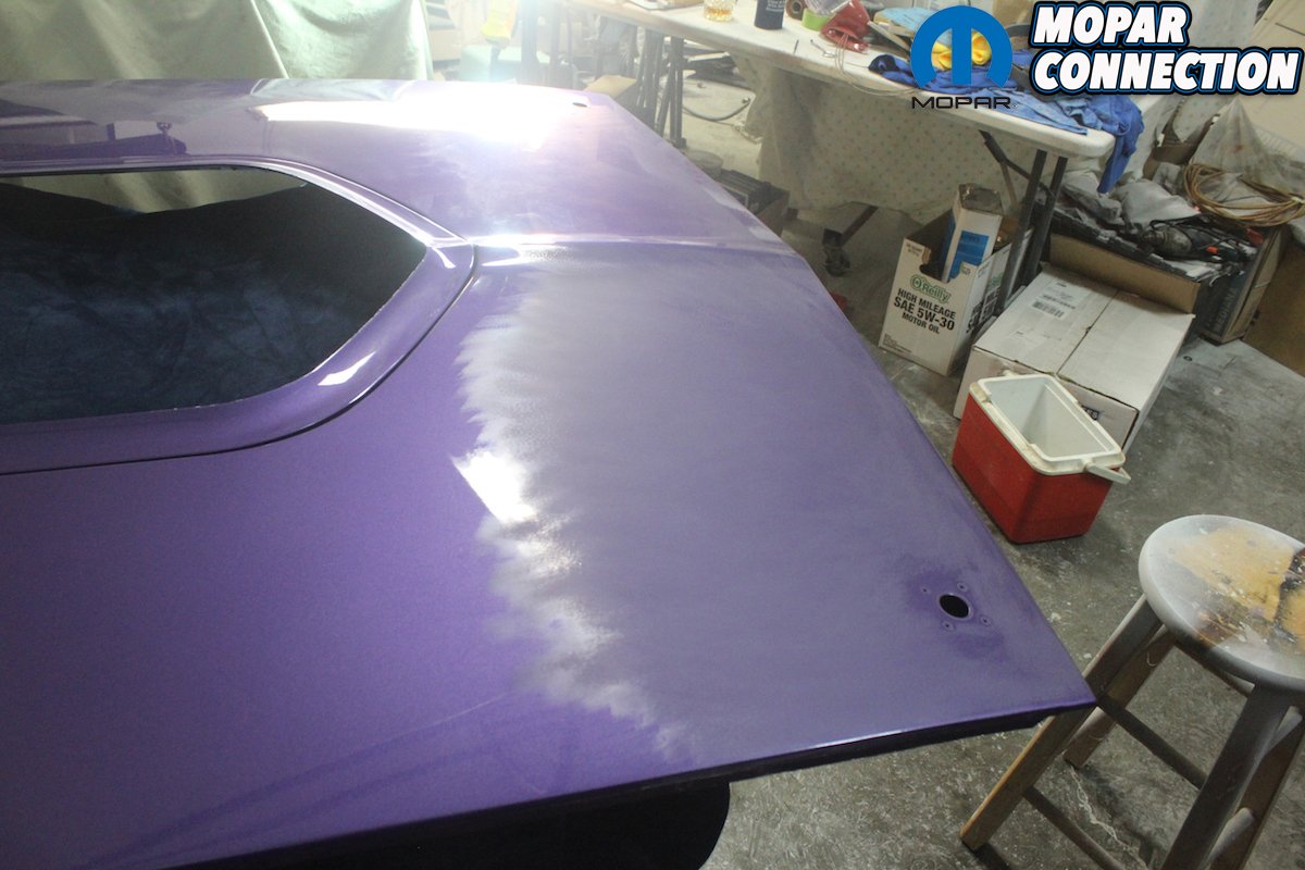 We chose to use the very best paint PPG produces on the Comeback ‘Cuda. Some people succumb to the temptation of using cheaper brands, but you want it to be the best it can be and to last for 20-plus years. We find that PPG has the closest match to the original formula. Yes, originally the paint was single stage metallic, but base coat clear coat is a must with metallic paints. We used two gallons of DBU base and two gallons of DCU 2002 clear un-reduced. Adding in the reducer and hardener, and we shot a total of three coats of base and two heavy coats of clear. Others may need three coats of clear if shot in lighter passes. We bought the DeVilbiss D-cup products for our gun. They are larger, sealed plastic bags that hold the paint; you never get any drips and can hold the gun at any angle. When shooting close to 6 gallons of paint, being able to mix up several cups of paint at once helps a long process go quicker.