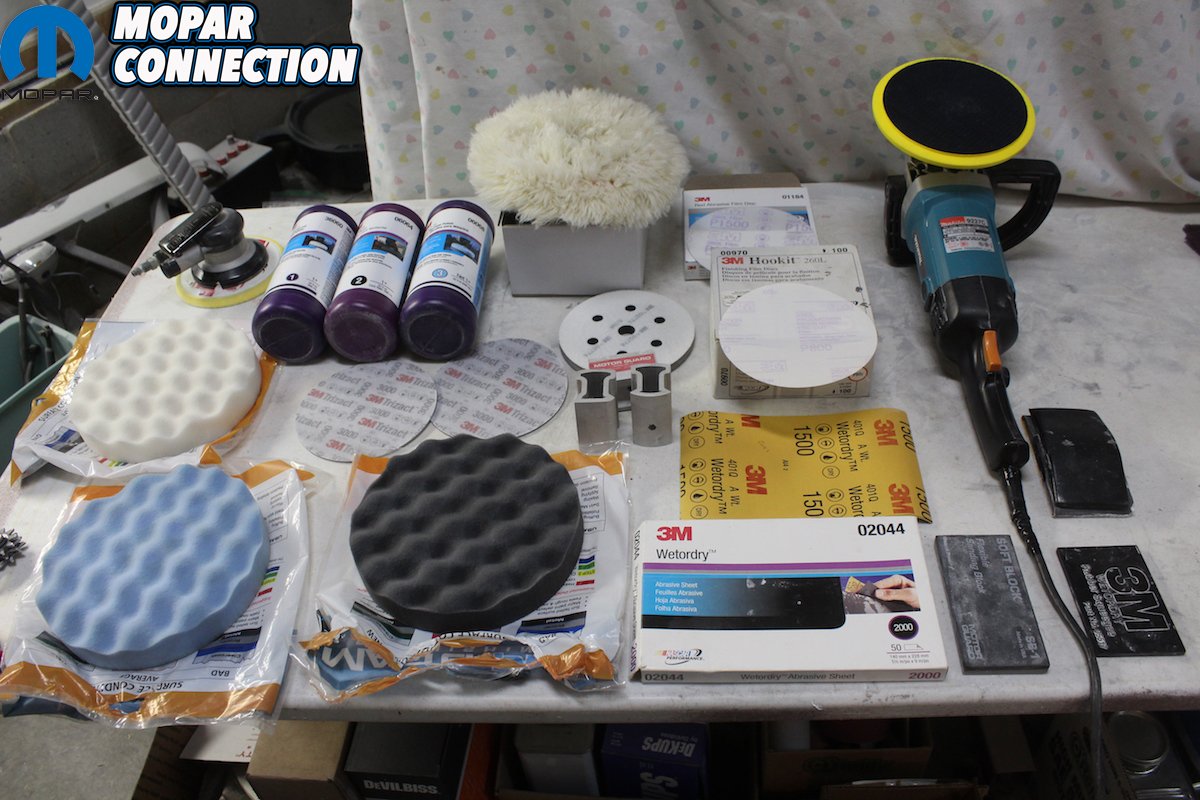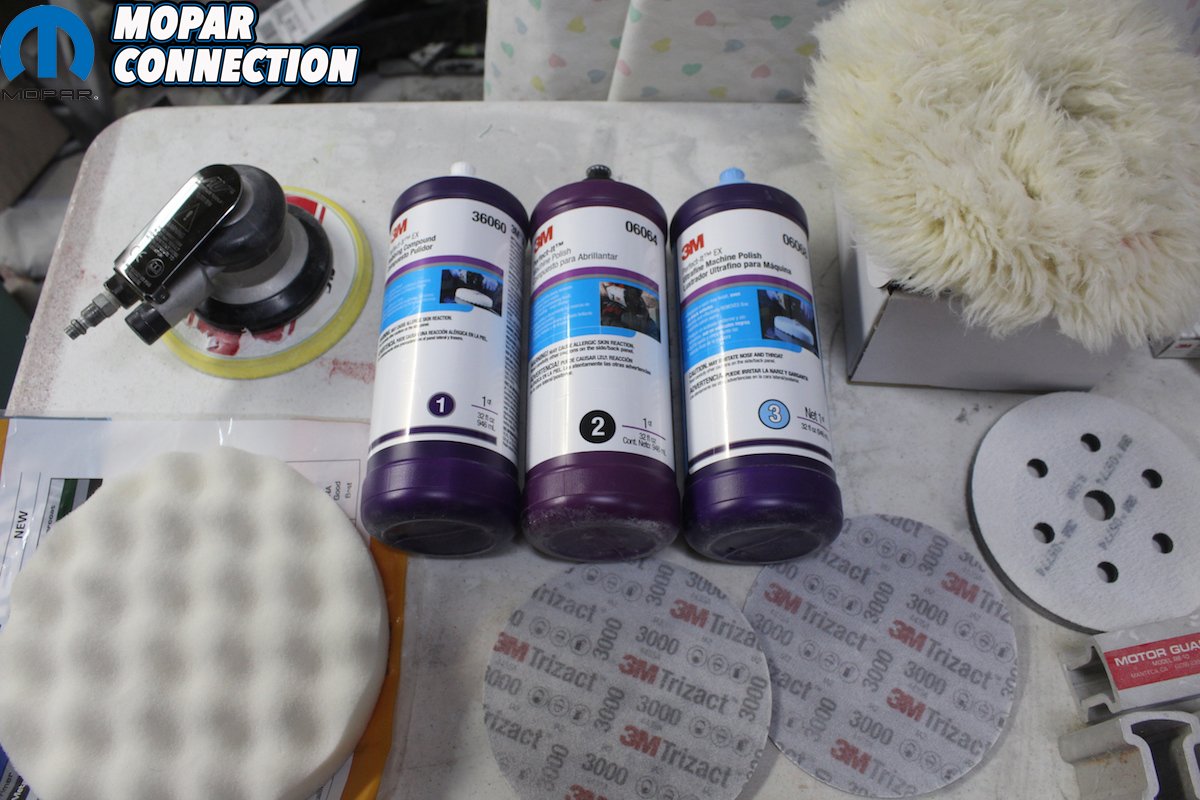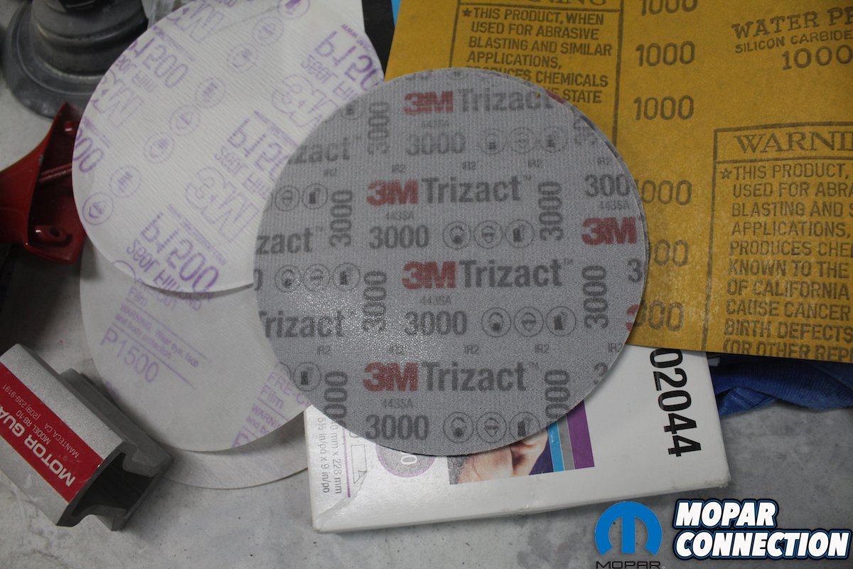 We used the 3M sanding film and finishing system. With a short throw palm sander and a “hook it” disc, we started with 800 grit discs, followed by 1500 grit discs. We used 1000 wet sanding paper to get out any runs, followed by 1500 and then 2000. After that, we used the Trizact 3000 pads wet. Then we used the #1 compound with a wool pad, followed by #2 compound and a black foam pad, followed by #3 compound and a light blue foam pad. After final assembly, we went back over the car with a black foam pad and swirl mark remover followed by hand polish from Zainos.
