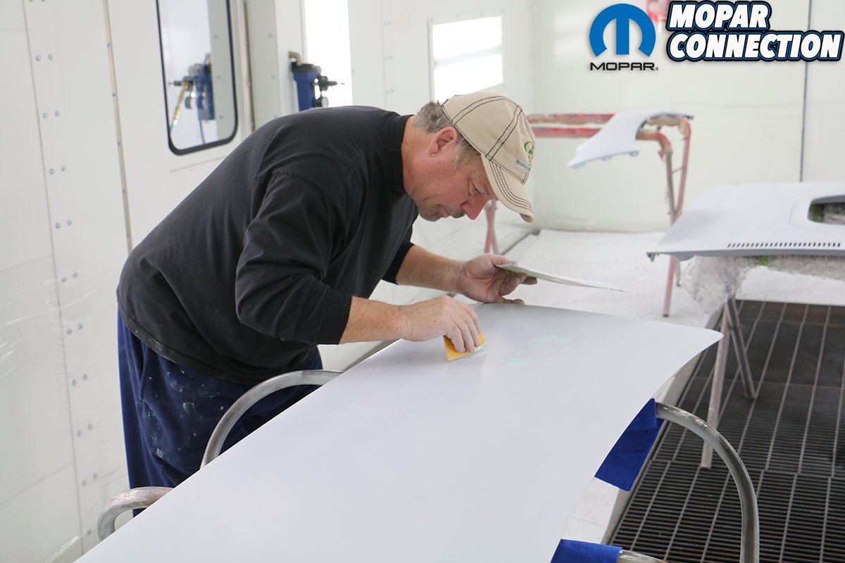Above left: Even though there have been countless hours spent on getting the Comeback ‘Cuda ready for paint the final inspection and cleaning is paramount for getting a flawless paint job. The early morning natural light helps any imperfections show up. 600 grit paper and a paint stick help to smooth out a small ripple in the primer. Above center: Any imperfections are repaired now. During transportation a small chip occurred in the corner of the trunk lid. We repaired any pin holes and chips with filling body glaze or even regular filler depending on the size of the problem. After it dried we sanded with 400 – 600 grit paper. Since we will be shooting the entire car with sealer, these scratches will not show up in the final finish. Above right: Thanks to much needed help from our Mopar buddy, Chet Biggers. He went over every inch of the car with a grey scotch brite pad, an air hose, and a micro fiber rag. Having two sets of eyes is always better than one. He also used the air hose to blow out the frame rails and any inner panels. You can’t get the car clean enough before moving it into the booth.