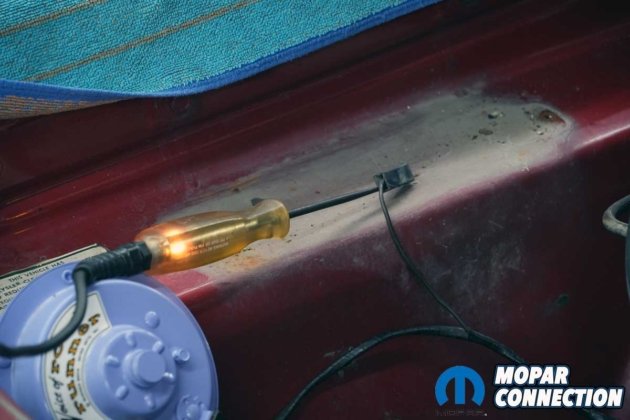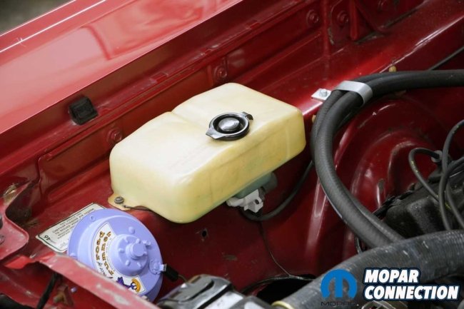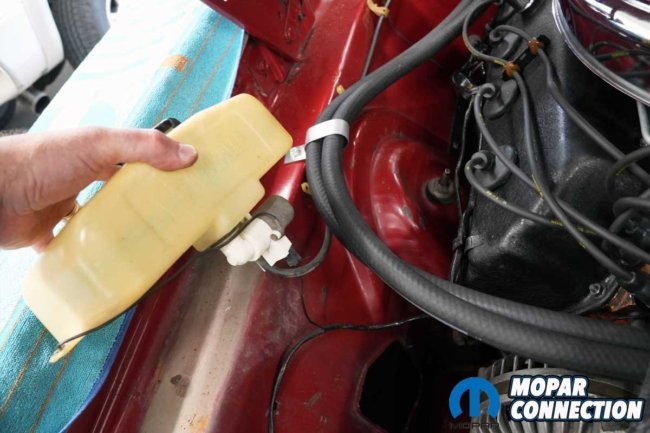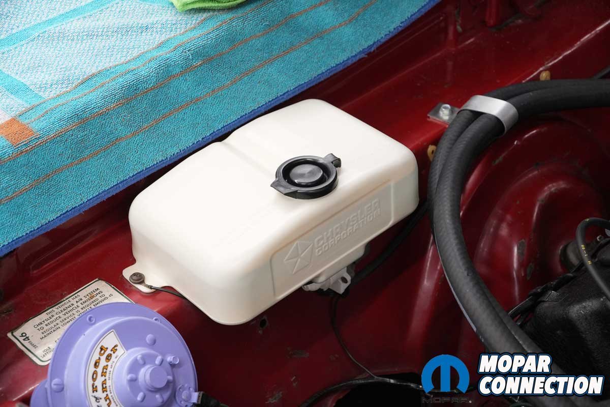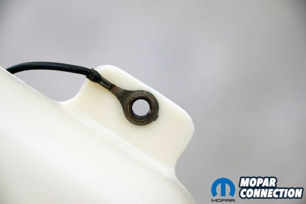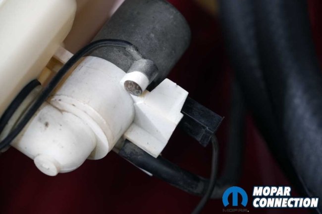 When we acquired the Road Runner, the original windshield washer reservoir was still in place, but time had not been kind to it. Stress cracks blanketed much of the aging plastic, and the washer motor was completely nonfunctioning. Before ordering replacement parts, we needed to determine whether the failure was electrical or mechanical.