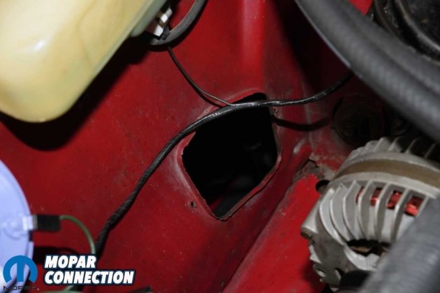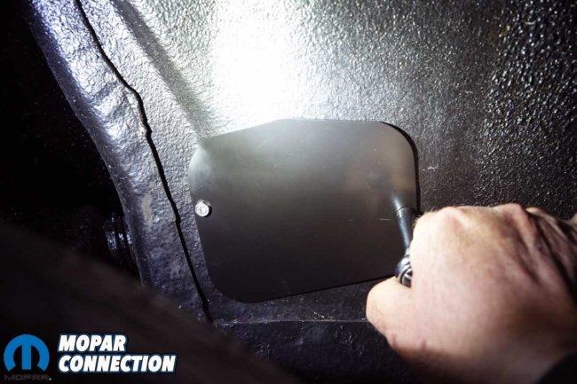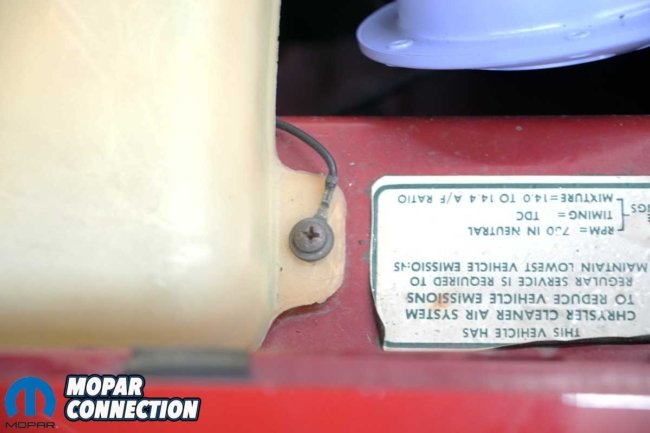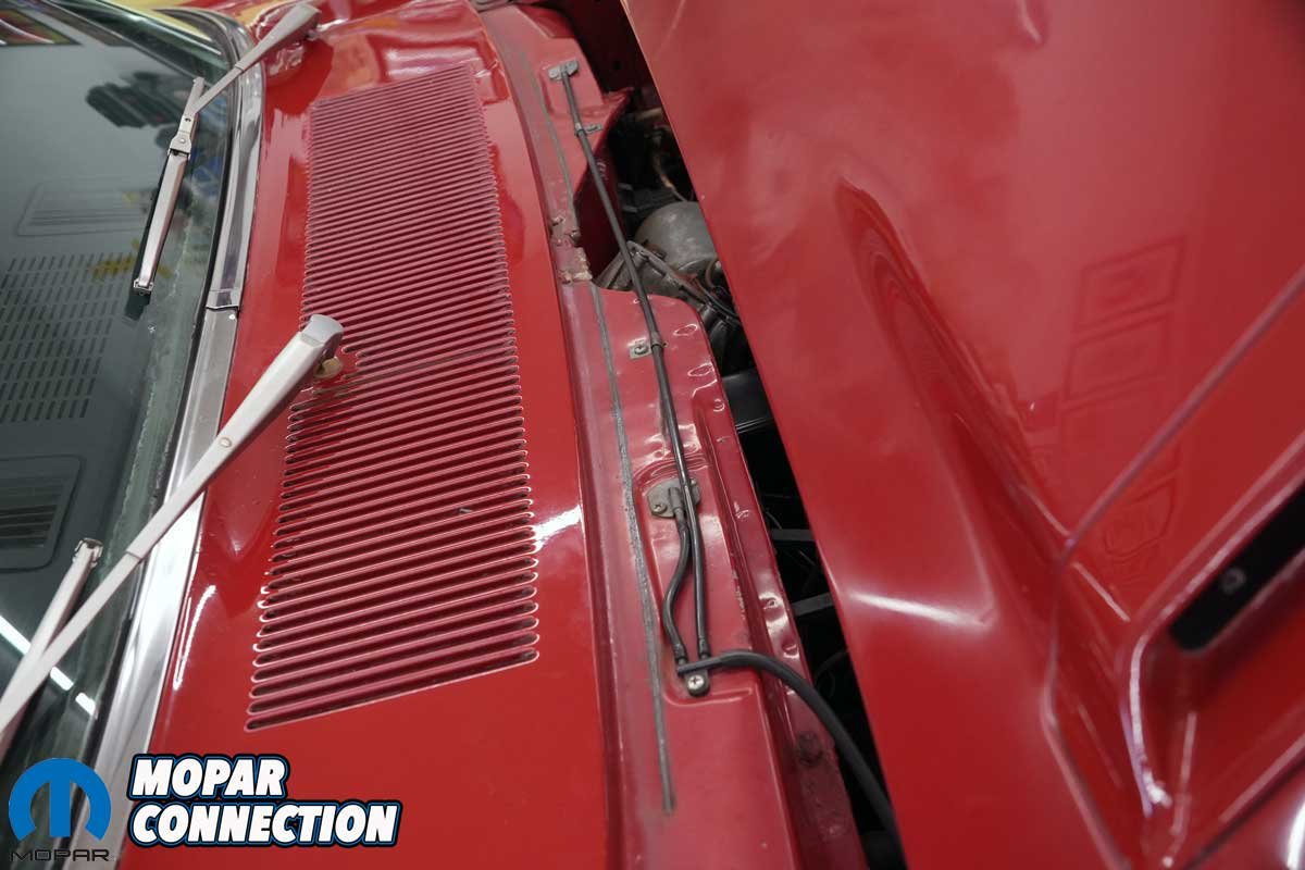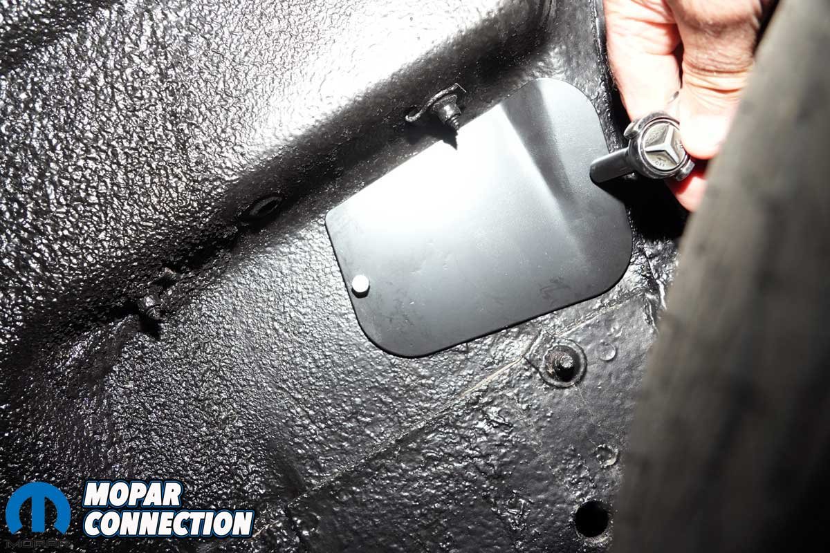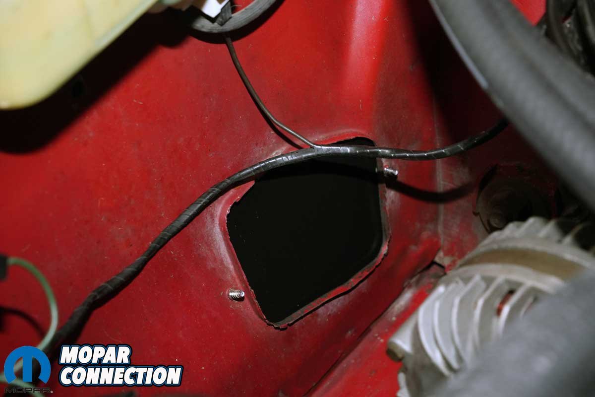 Above Left: We snugged both bolts. The cover does nothing more than keep excessive debris from entering the engine bay. Above Right: The cover’s screws extend into the engine bay, just like they did when the Road Runner left Lynch Road in 1968.