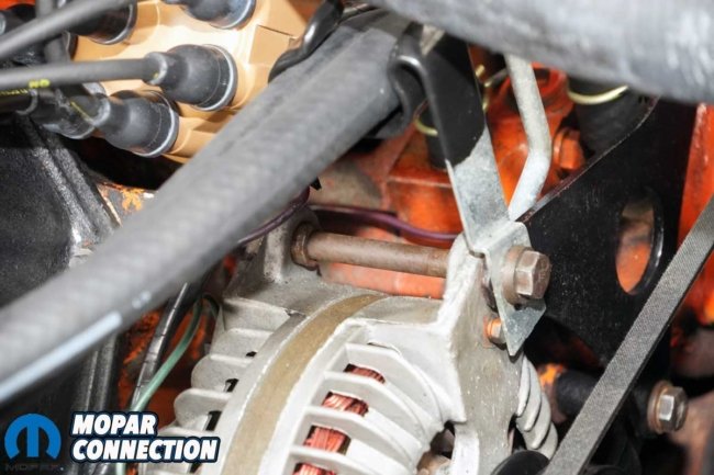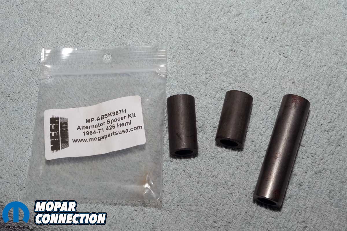 Above Left: The alternator was missing one of its spacers. Over-tightening the mounting bolt could have damaged the original, correct part-number alternator. Above Right: We picked up a 1964-71 426 spacer kit from Mega Parts. We only used the longest of the three spacers, along with the original spacer still on the alternator bolt.