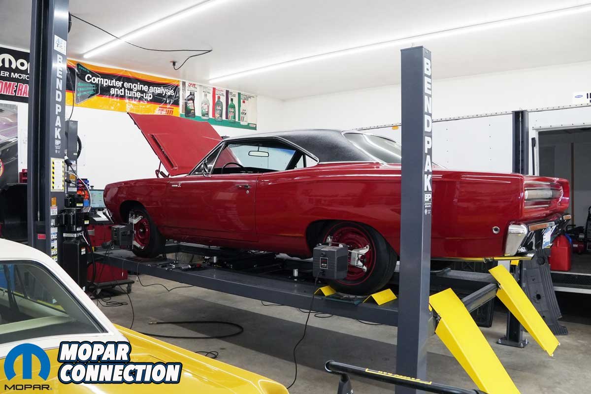 Above: We aligned the Road Runner with our Hunter P411 aligner. The front wheels were on turntables, and the rear slip plates under the rear tires. Although we had the factory specs from the Hunter machine, we adjusted the angles to our own specs to take advantage of the bias-ply appearing radial tires.