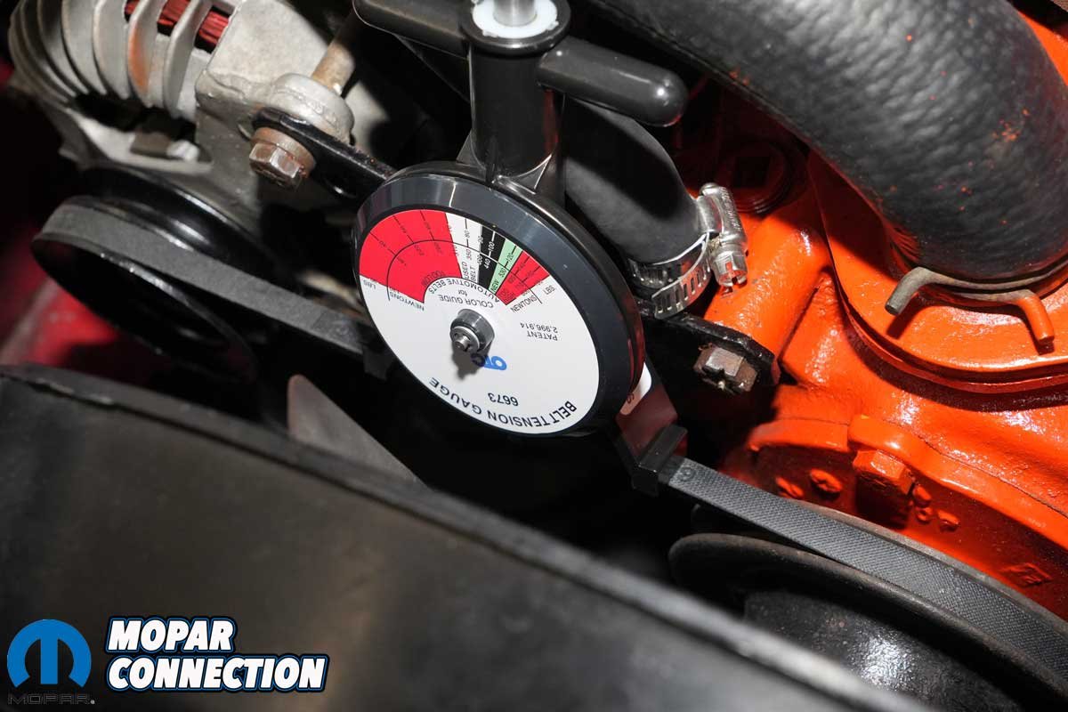 Above Left: We found the correct part number alternator belt from Herb’s Parts. We tensioned it with a belt tension gauge. Above Right: The belt was routed from the crankshaft pulley to the water pump pulley and to the outer groove of the alternator pulley.