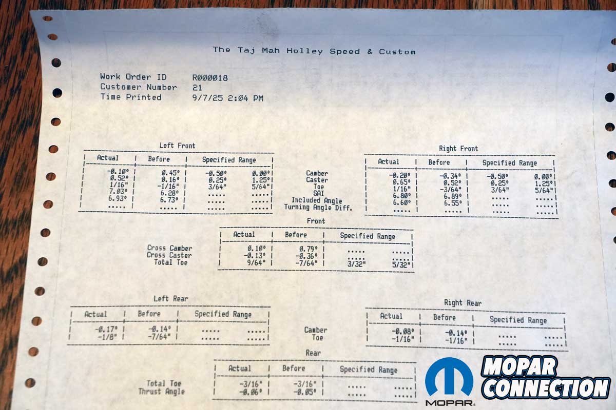 Above: Although we are limited in our camber and caster adjustments due to the factory upper control arm eccentrics, we were able to achieve slight negative camber and more than 1/2-degree caster. The negative camber will promote excellent performance and tire wear, and the positive caster will provide directional stability and steering wheel returnability. The toe was set to a toe-in condition. There was nothing we could do with the rear angles because of the solid rear axle.