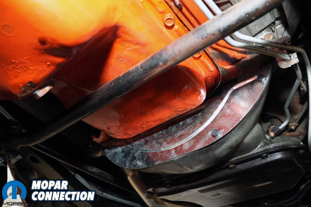 Above Left: As noted in our transmission service story, the Road Runner was missing the 727’s bell housing dust shield. We sourced a replacement, along with the correct retaining bolts, from Year One. Above Center: The new shield had a small, raised area, which we carefully tapped flat with a body hammer for proper fitment. Above Right: Without a dust shield in place, the bell housing opening leaves the transmission vulnerable to road debris that could potentially cause damage.