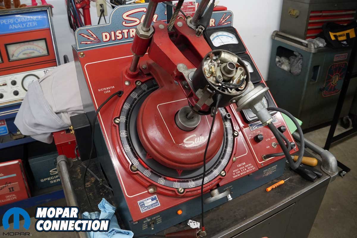 Above Left: We installed the distributor on our Sun 404 distributor machine to set the dwell and verify both centrifugal and vacuum advance operation. Above Center: After adjusting the dwell on each set of points, we confirmed a combined total dwell of 40°. The centrifugal advance measured 22°, with the vacuum advance contributing an additional 18°. Above Right: Once testing was complete, we reinstalled the distributor and snugged down the hold-down bracket and retaining bolt.
