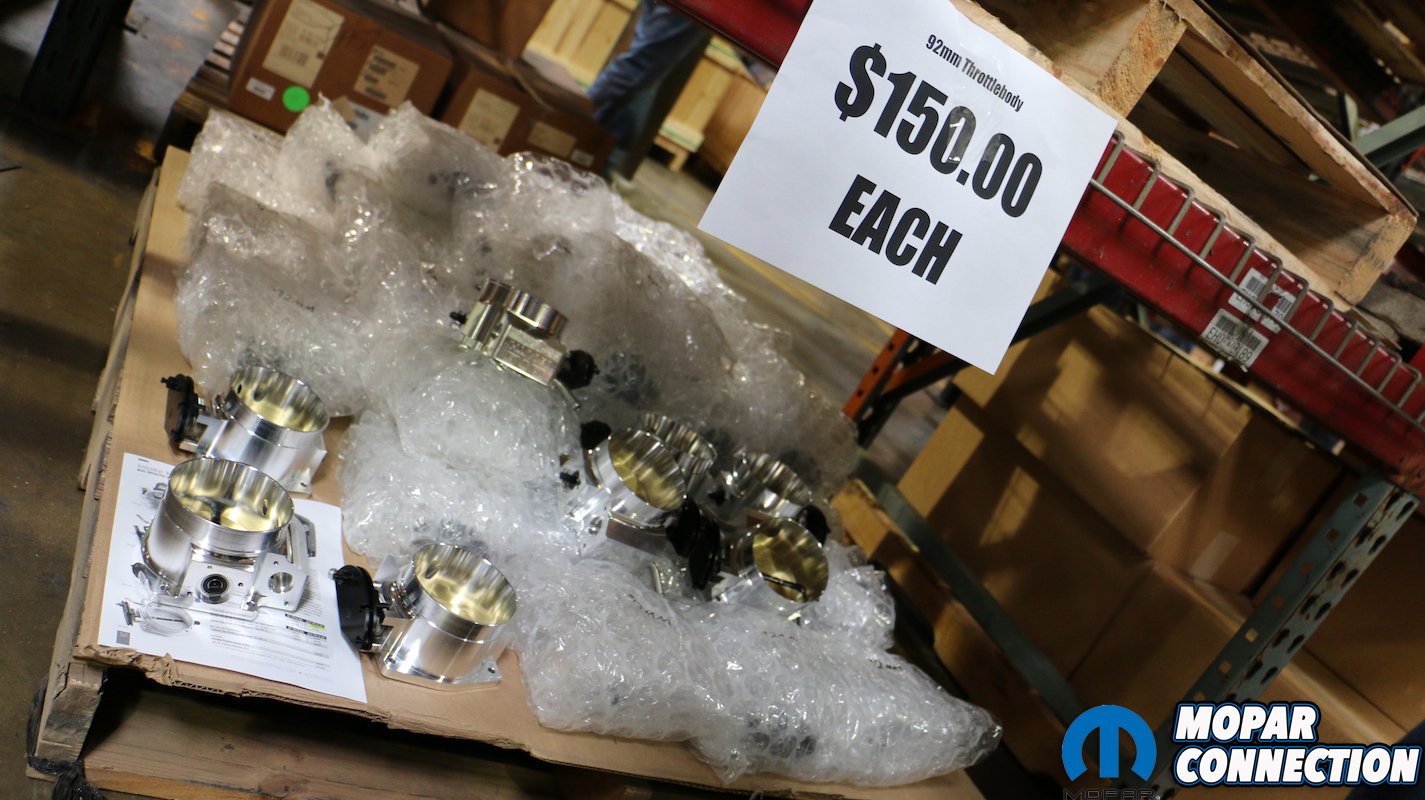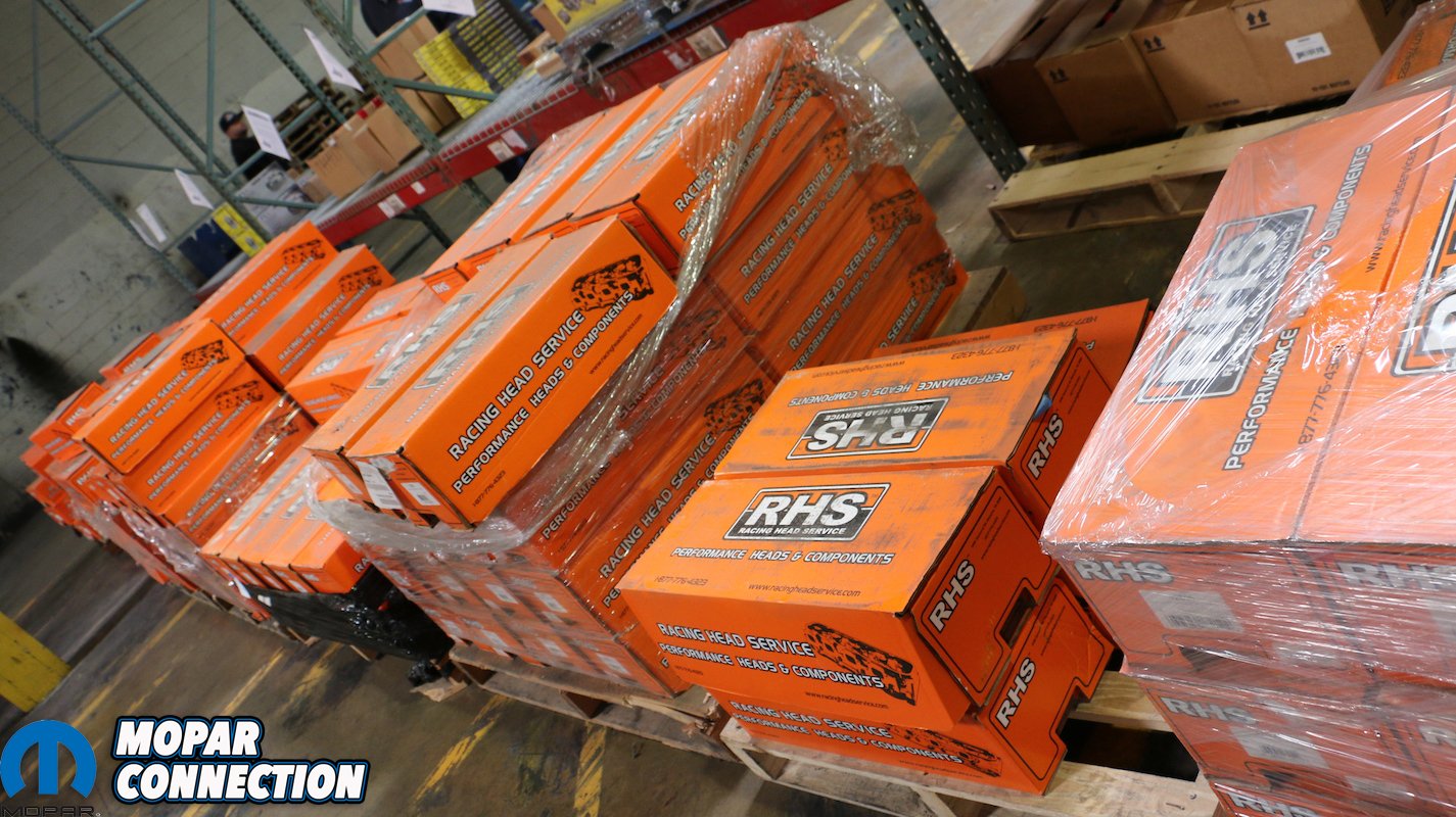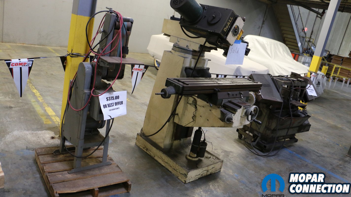Visitors were given free admission to both peruse the rows of double-head-high racks, tables and pallets of products. While studiously looking over various cam grinds, cranks and ignition items, the furthest wall drew our attention as it was lined with engine hoists, stands, bench grinders, drill presses and other machining tools. Additionally, in a cordoned-off corner were rows of engine blocks in various stages of disassembly, and well as a complete 5.0-liter Coyote drivetrain and engine cradle (replete with control arms and rack & pinion).