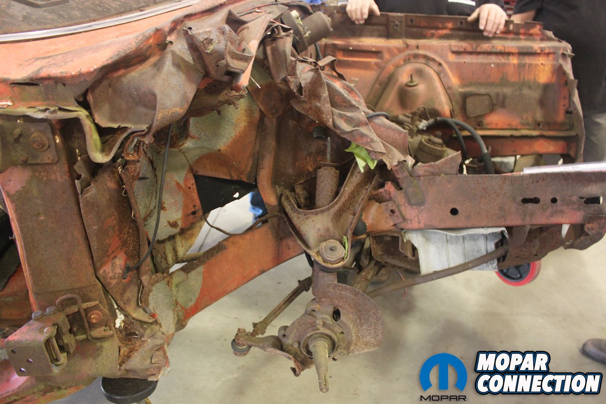 Once the team at Classic Muscle Metal got their hands on the Daytona, what was left was quickly stripped apart so they could see what little they had to work with. It appeared that in the accident, the hardest hit was done to the right front corner, leaving the inner fender, frame rail and cowl badly damaged. Since they weren’t fixable, the inner fender and frame rail were removed to make clear for new pieces. The same was done with the remainder of the quarter panels and the roof skin. From there, the rest of the bent and rusty metal was removed leaving only a bare skeleton.