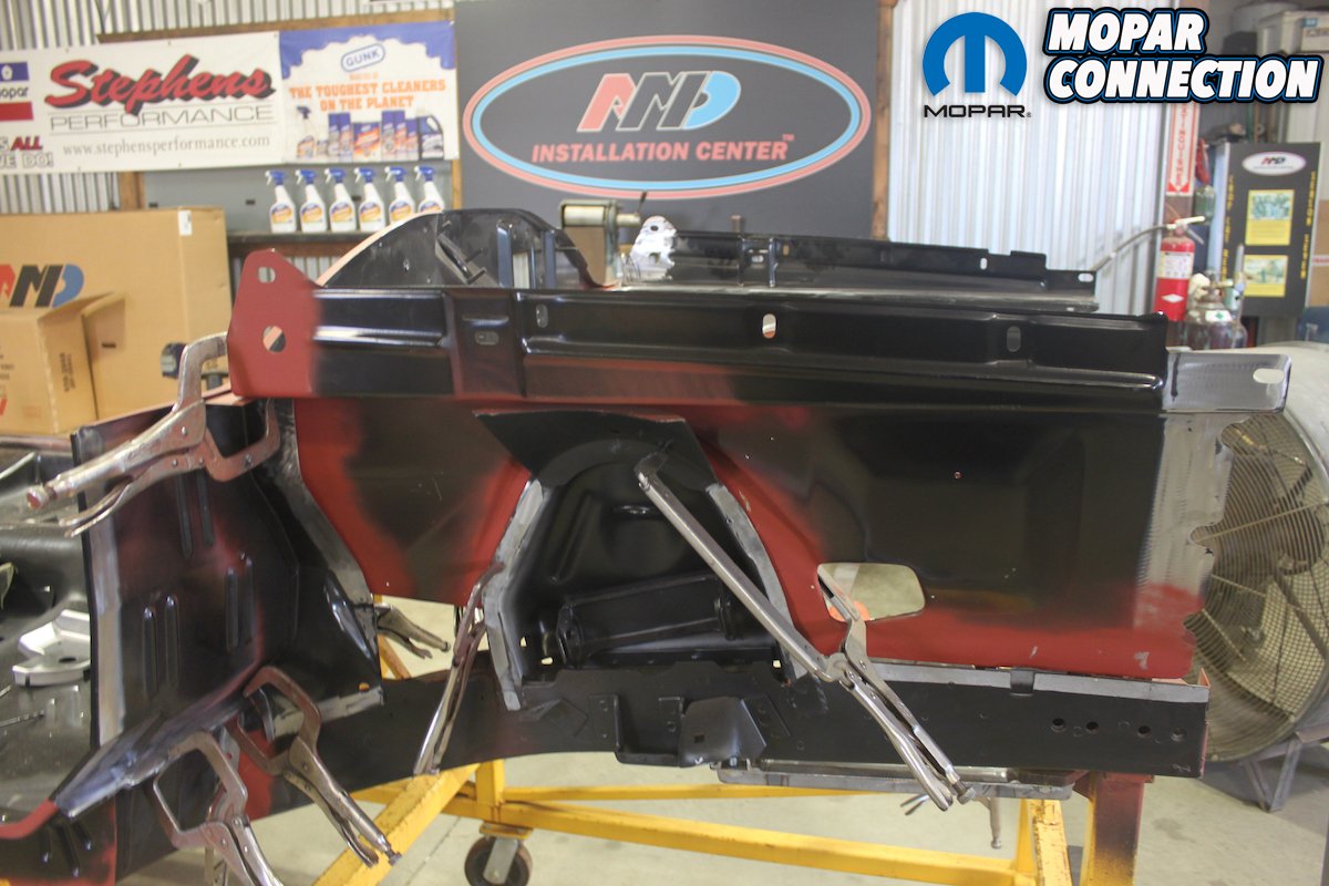 Above far left: That looks a lot better than the original mangled mess we saw previously! AMD practically makes everything you’d need to rebuild your B-body. Above middle left: Once the original core skeleton was mated to the brand new AMD lower structure, the Daytona started looking like a car again. Above middle right: The highly trained team at Classic Muscle Metal hard at work installing the radiator support. They make sure everything is 100% to spec and better than it came from the factory. Above far right: With the brand new metal installed and some of the original stuff repaired, you can’t even tell this Daytona was in a bad accident!