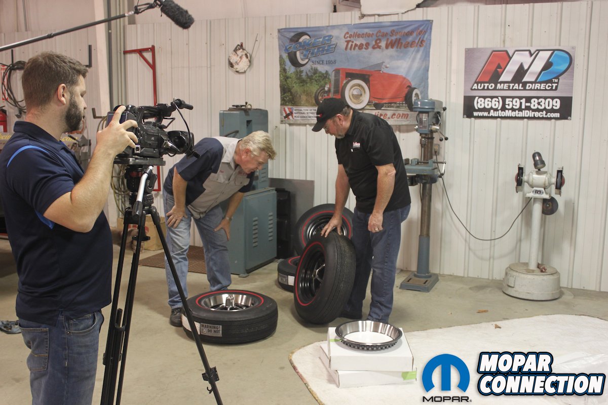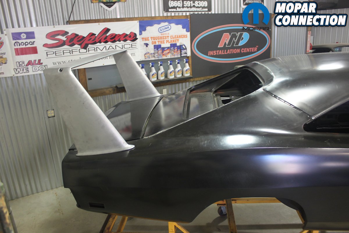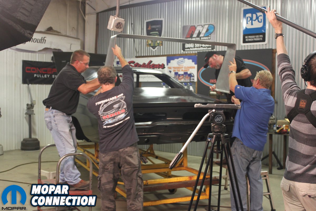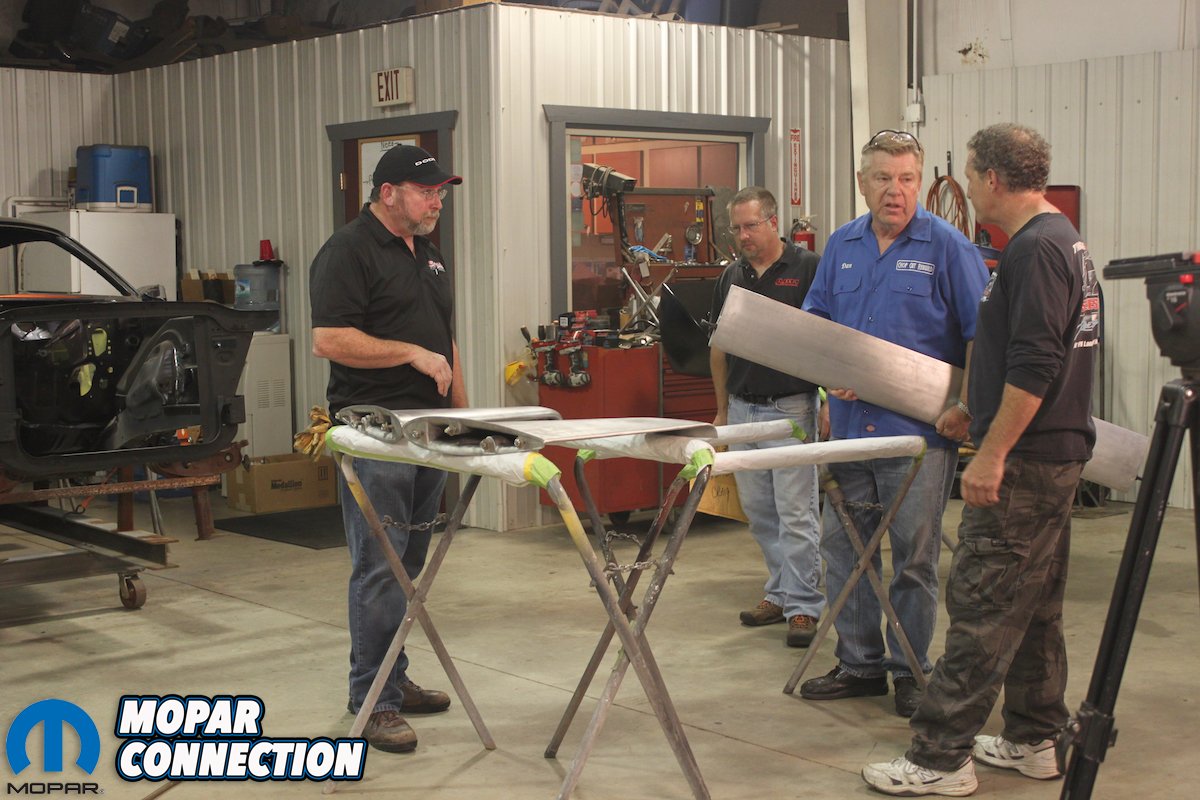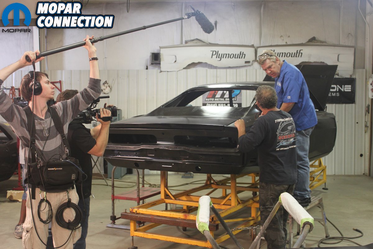 Above left: With the addition of the front sheet metal and legendary nose cone, this Daytona is finally looking like the winged warrior it is! Above right: Dan Woods and the guys from Classic Muscle Metal look over the rear window plug and wing holes while being filmed for Chop, Cut, Rebuild.