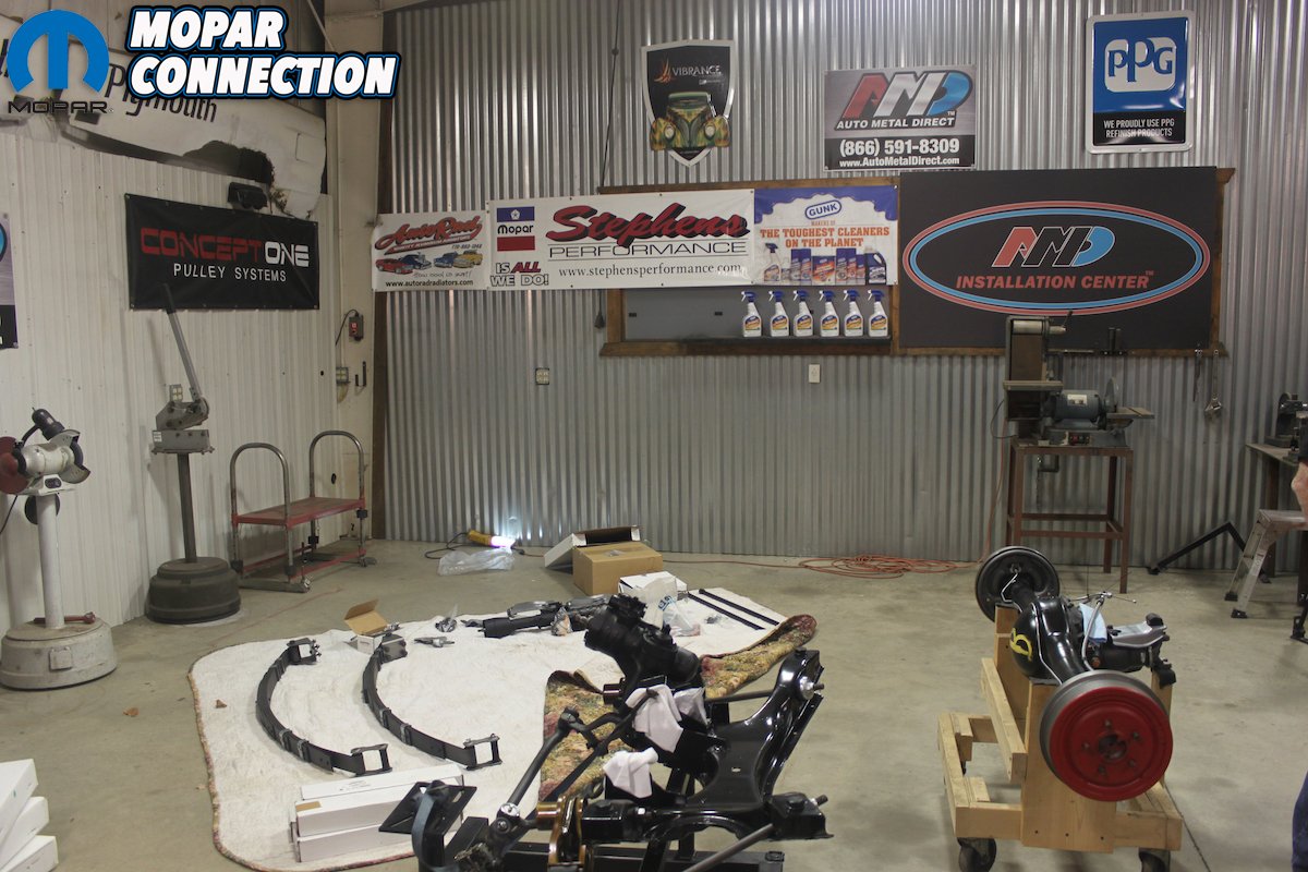 Top left: Dan congratulates AMD Installation Center’s Craig Hopkins on a job well done. This was a true team effort! Way to go everyone! Top right: The front suspension, 8 3/4 rear end and various other suspension goodies await their install. Bottom left: The team hard at work getting ready to install the front suspension and K-member assembly. Bottom right: Can’t beat fresh wheels and red line tires. There is just something about them.