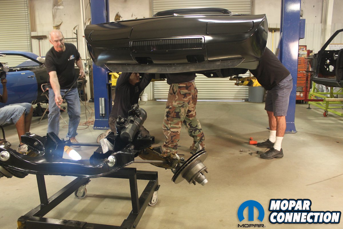 Once that was complete, using a special jig, the crew welded together a brand new bottom structure for the Daytona using Auto Metal Direct reproduction pieces such as rear frame rails, torsion bar cross member, floor pans front to rear and front frame rails. When that was all ready to go, the original skeleton of the Daytona was lowered into place on the assembly and everything was buttoned together. Finally 405184 was looking like a car again. The guys then added the critical Daytona only pieces such as a mint condition nose cone, fender scoops, rear window plug and wing to make this Charger look like its former NASCAR bloodline self again.
