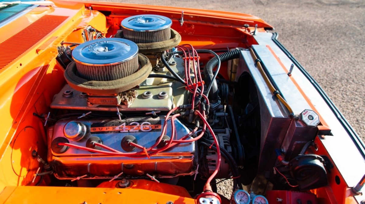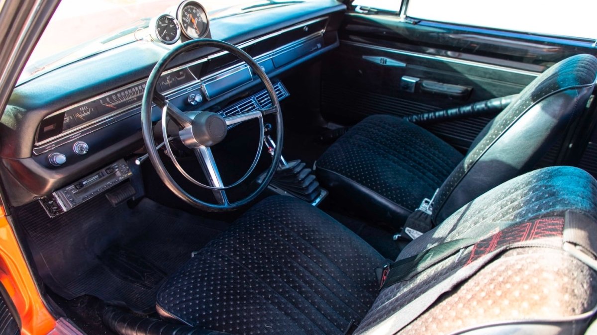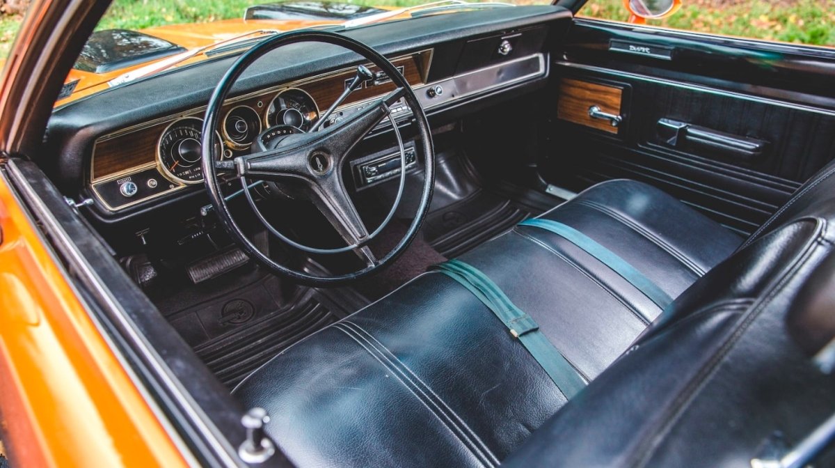 This auction features a couple of Hemi powered Darts, including this Bright Orange one you see here. Under the hood sits a Ray Barton Hemi fitted with a cross ram intake and dual 4-barrel carburetors backed by a 727 Torqueflite automatic transmission. While it’s built to go fast in a straight line, it does have A/C to help stay cool on those hot days!