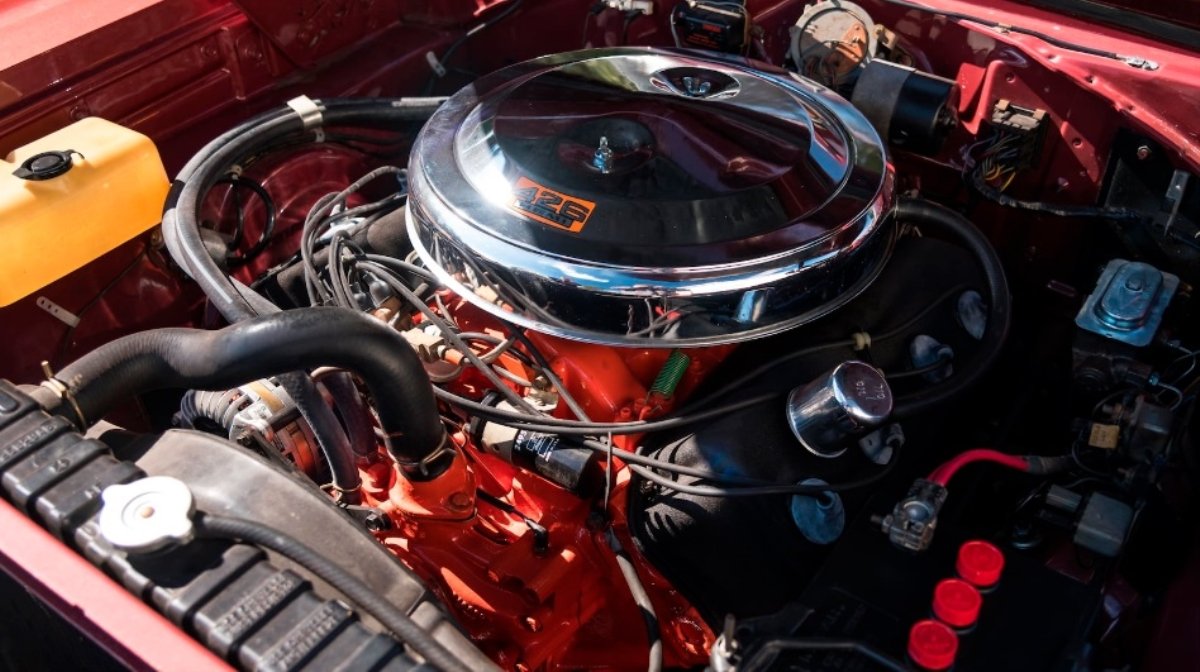 Sold new at Hughes Motors Inc. in Middletown, Ohio, this ’66 Belvedere still retains its original numbers matching 426 Hemi and 727 Torqueflite automatic transmission. It’s loaded with tons of documentation such as its original Certi-Card, broadcast sheet, IBM card, original owner’s letters and original fender tag. Its painted QQ1 Dark Red Metallic and has a matching red vinyl/cloth interior. It rides on color matched steel wheels with dog-dish hubcaps for the perfect sleeper look.