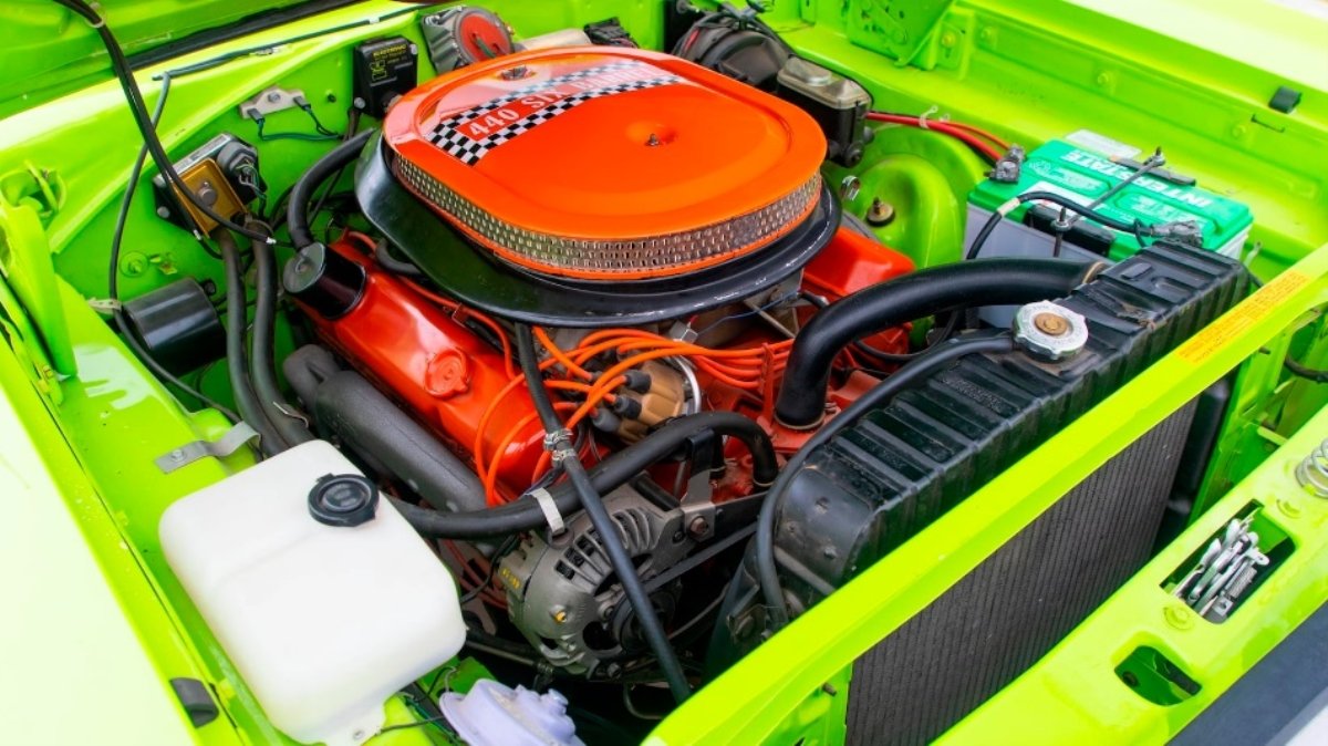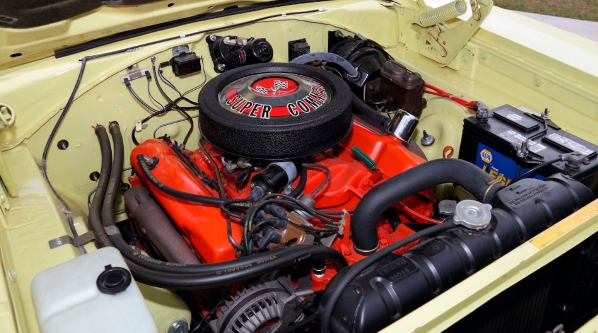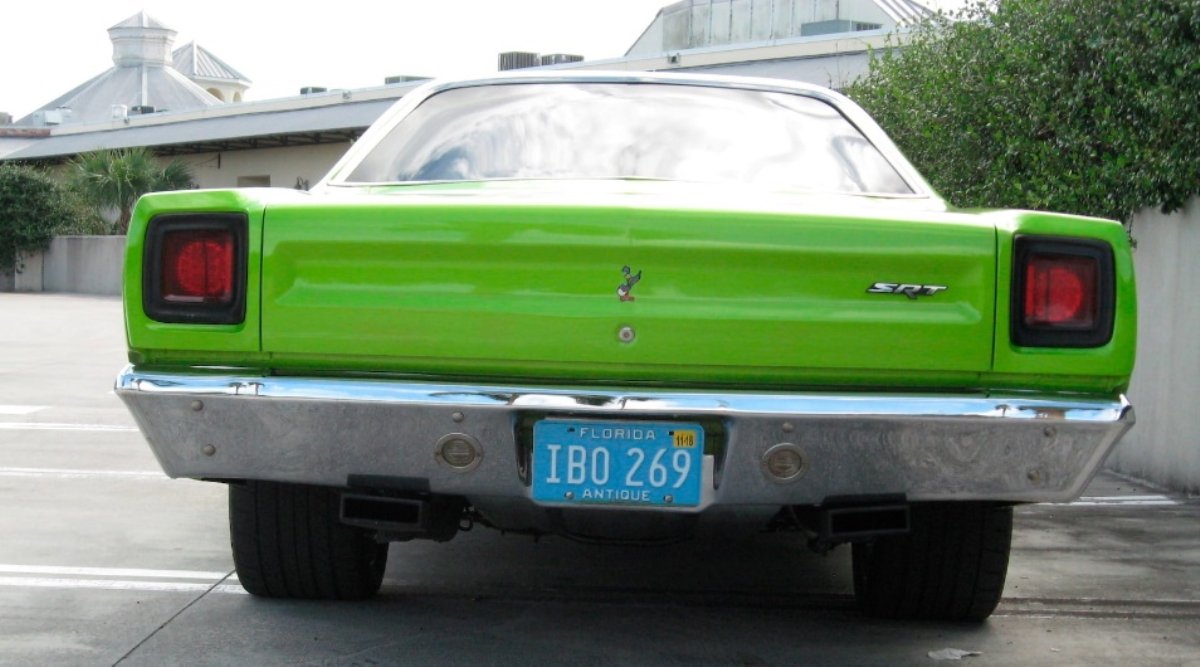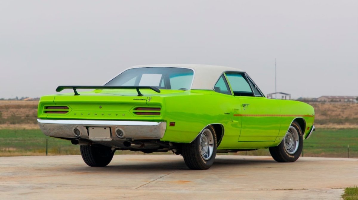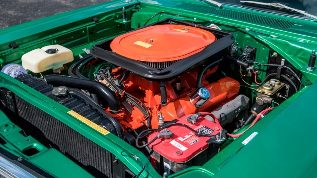 This jaw dropping V-Code automatic Road Runner coupe also comes from the Ronnie Rains Collection. Equipped with an Air Grabber hood, rear Go-Wing, power steering and power brakes, this Road Runner has the perfect color combo; Lime Light with a white vinyl top and a black bench seat interior. Absolutely stunning!