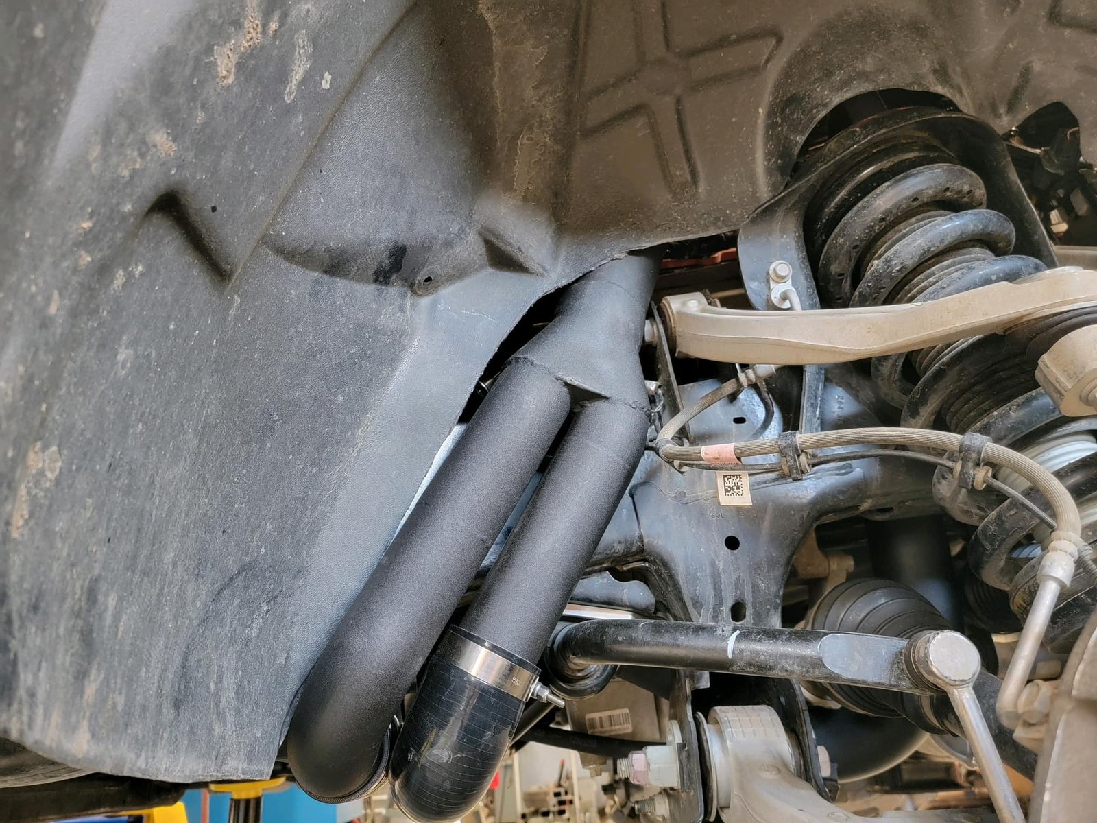 “The air inlet to each turbo routes up to the top of the engine compartment and bolts right up to the massive factory air cleaner. With such a cool factory scoop we wanted to keep it functional. Some vehicles do not have room to keep the factory scoop, but in the case of the RAM 1500, we were able to keep the entire system functional,” said Urist.