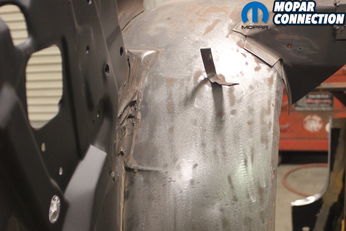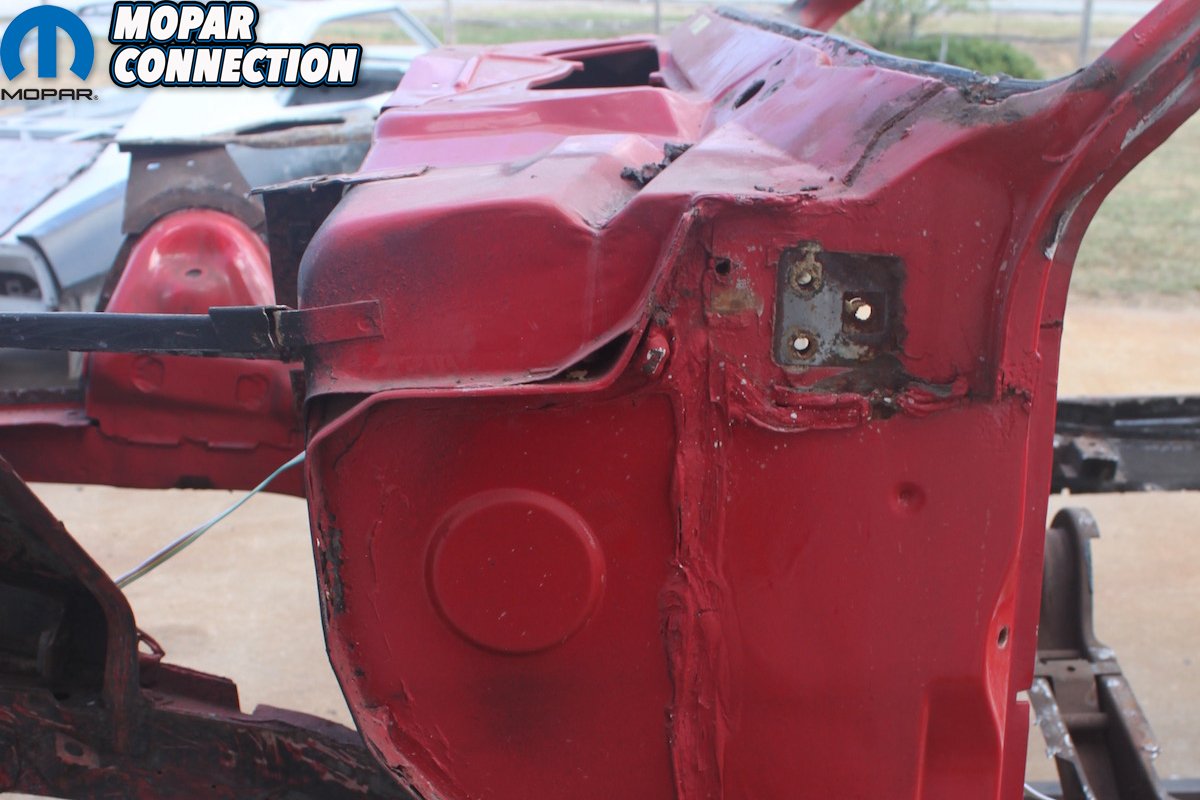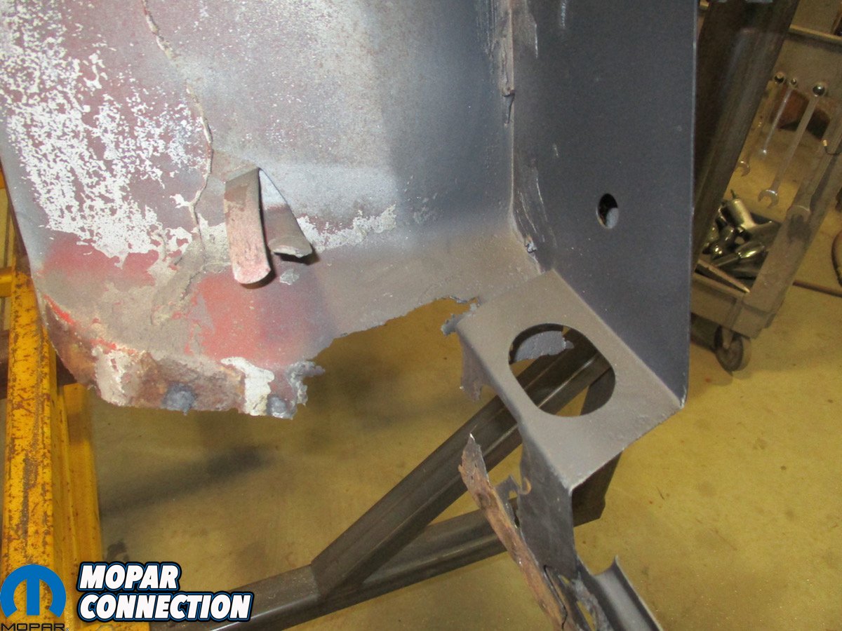 Above Left: Whoever did the conversion of the 1970 318 Barracuda convertible to a Hemi ‘Cuda convertible cut a lot of corners to say the least. They left the 22-inch radiator support and radiator in the car. Since all Hemis came with a 26-inch radiator and support we had to make the change. Above Right: We were able to keep the top cross member of the original radiator support and replace the passenger side panel with the 26-inch piece. The driver’s side panel is the same in both the 26-inch and 22-inch radiator support. The grille surround is the original and has been blasted and hit with grey primer.