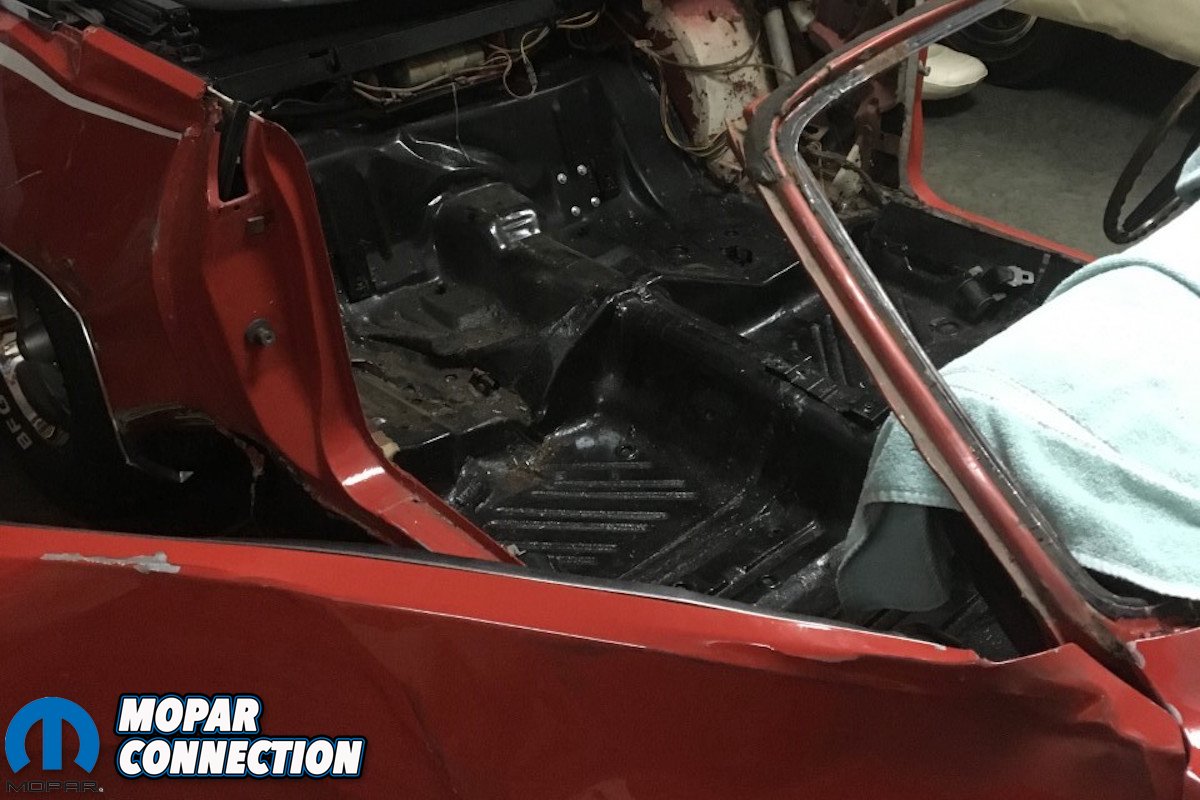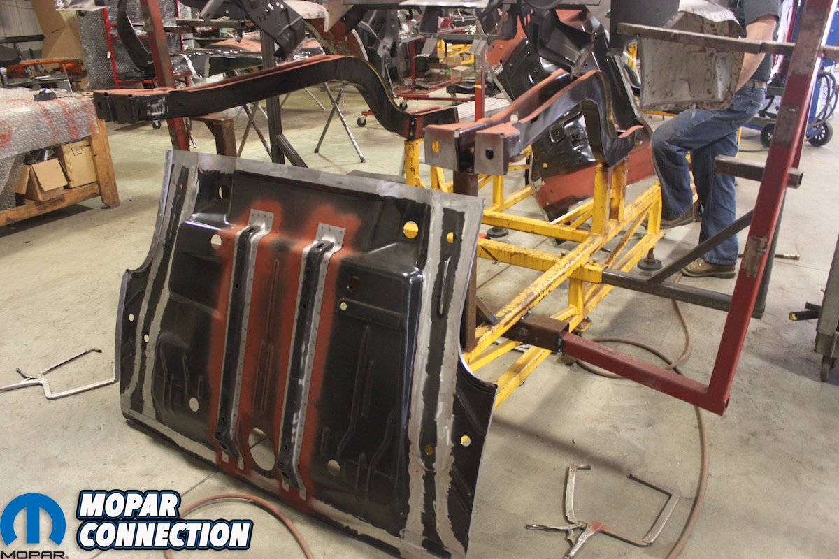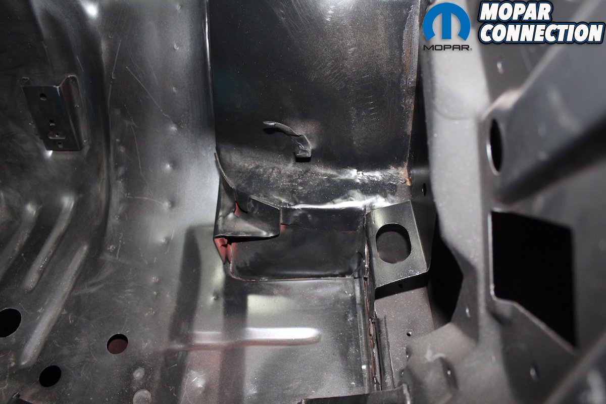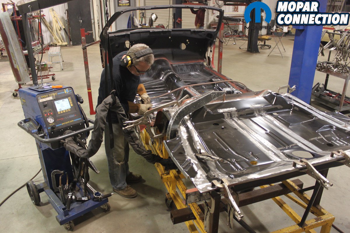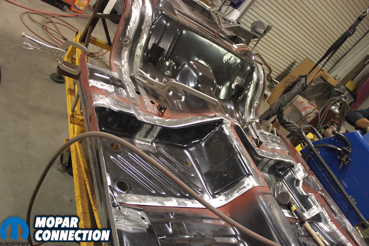 Far Left: After getting the frame rails blasted there was too much “rust through” to use them. Craig added these frame rails to the work order. One of the best parts about doing business with AMD Installation is zero doubt about the charges. You pay for the part and then the part has a set labor cost to install no matter how many hours is needed to make it right. Middle Left: The rear floor pan is then welded to the frame rails that are mounted perfectly in the jig. The spot welds look just exactly like the factory ones. The inner convertible structure is test fitted to guarantee correct alignment. After welding the metal is sealed. Middle Right: Here, one of Craig’s go to guys MIG welds any areas that need special attention. Since the rear frame rails are in correct position the remaining floor and truck pans can be welded in place. Far Right: Every seam is just like they were originally from Ma Mopar. No rust, no questionable welds, all correct factory measurements and alignment.