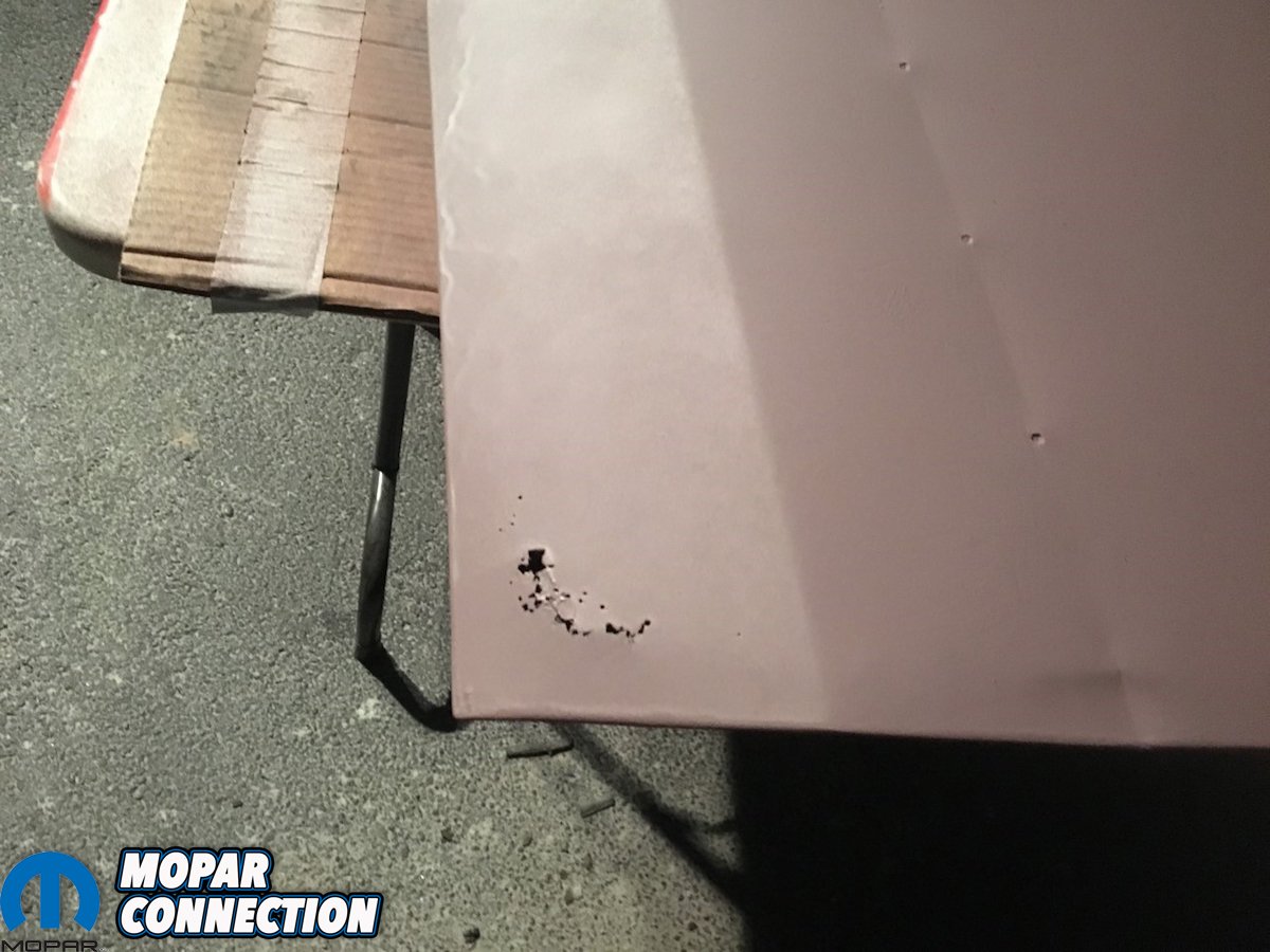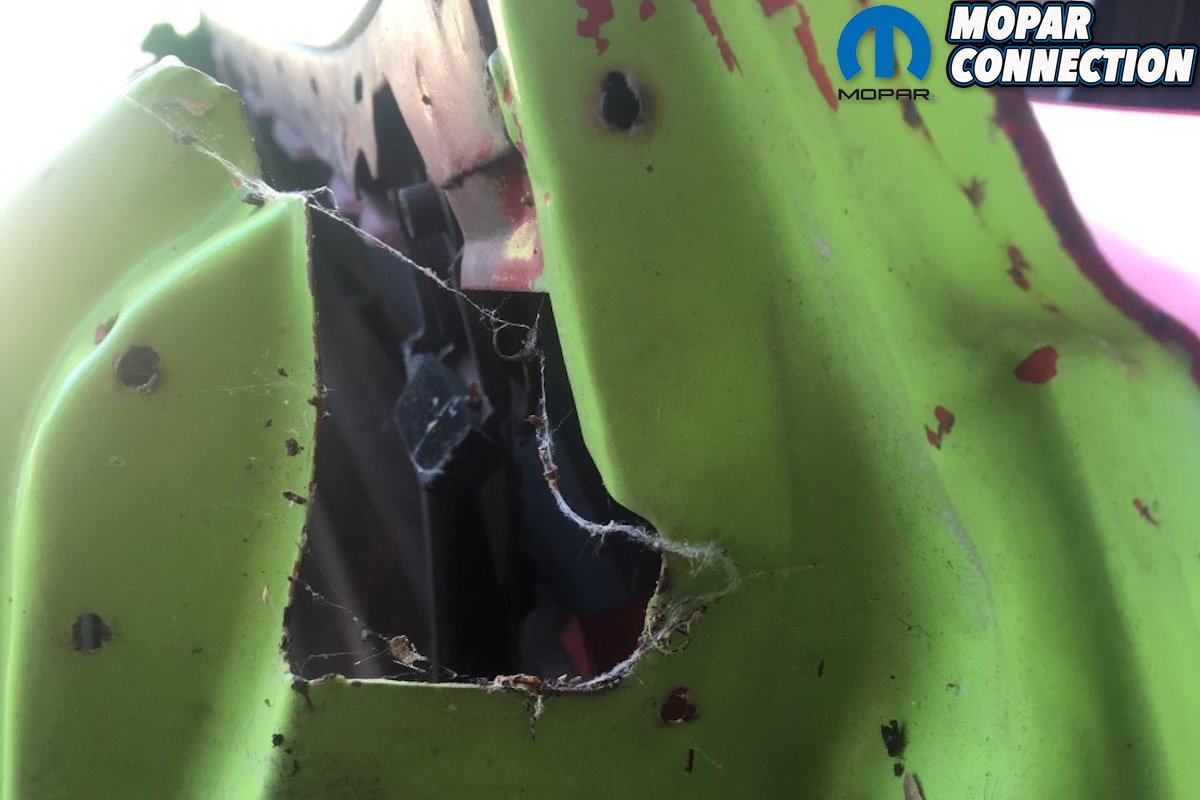 Far Left: Measurements and precision welds are a must when you start from scratch. These guys will not proceed unless they are positive the structure is within factory specifications. They have the talent and the experience to make it right. Middle Left: Just a quick reminder of what the passenger side looked like before taking the “Comeback ‘Cuda” to the intensive care unit in Cleveland, Georgia. Middle Right: While searching for original E-body convertible parts we answered an ad on Moparts connecting to “The E-body Convertible Guy”. After talking to him, he convinced us that we needed an original passenger convertible door and glass. He said he had rust free original parts and proceeded to insist on $2000 for the pair “because they are convertible parts”. After dropping over $7,000 for these and additional parts we received most of the parts. Far Right: The first thing we did was check the door and glass against our originals. The door was from a hardtop and had a rust out corner and tons of filler in it. Plus, the door glass had a chip on the top edge right where it could be seen. When we called about it he said, “All you have to do is drill two holes where the dimples are on the door”. After blasting the door and finding out just how bad it was, we finally got him to answer calls and texts. After much back and forth we gave him an opportunity to make it right. No cooperation from him. In this small Mopar world, everyone thinks the same about this guy. BEWARE!