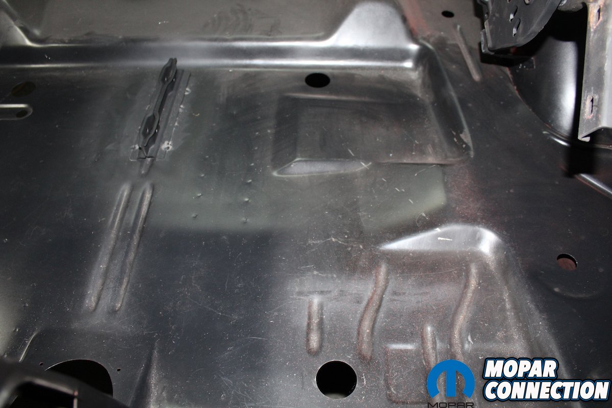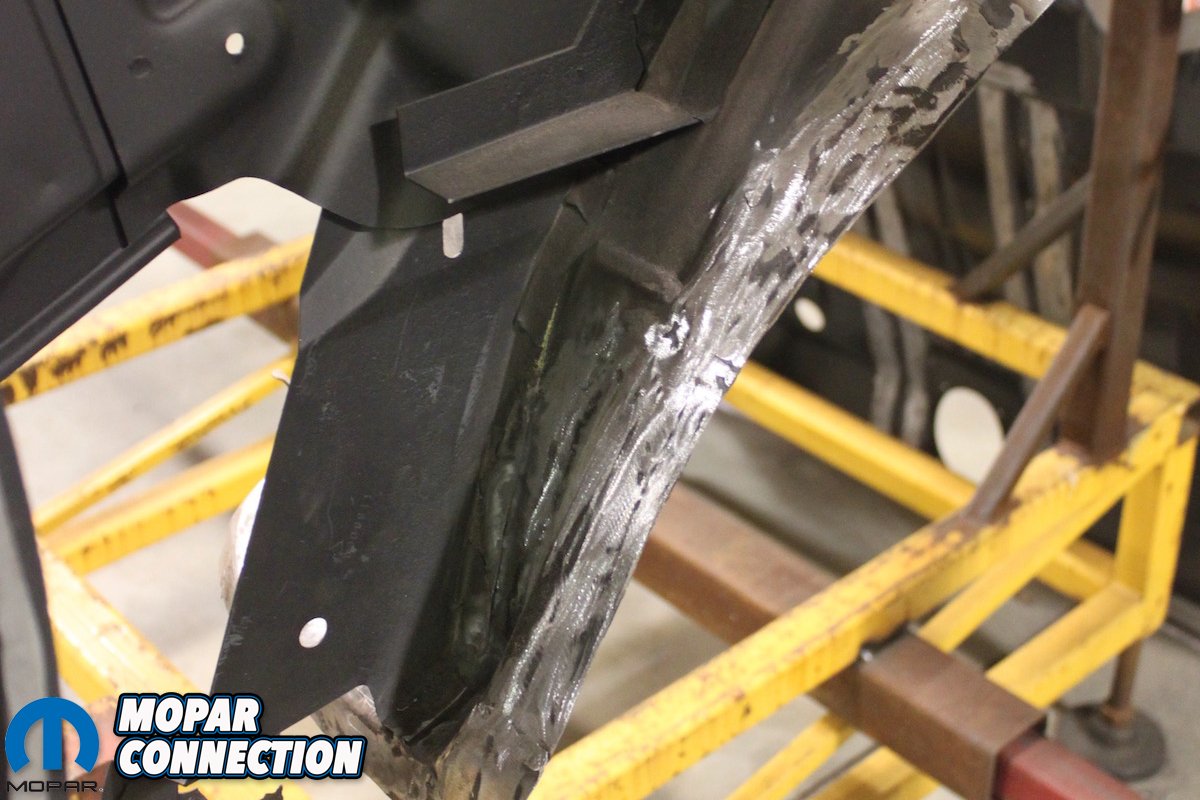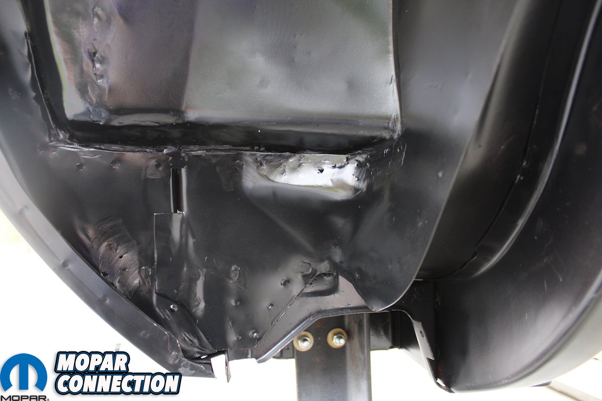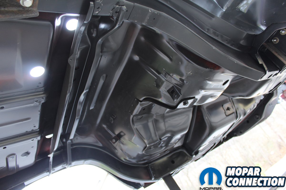 Above Left: The only way to achieve a factory correct undercarriage is to replace the full panel just like the factory. Patching in left and right, front and back floor partial panels, will always show no matter how much finish work is done. Above Middle: The precision that the crew at AMD Installation uses can be seen in every part of the new “Comeback ‘Cuda”. The rear panel, trunk floor, quarter panel, are all attached correctly without any extra patch welds or seams. Above right: Inner, outer, and convertible caps of the rear wheel wells were all returned to original condition. No quarter panel cut and paste here. When you reach inside and check the wheel, well lip, only factory seams will be there.