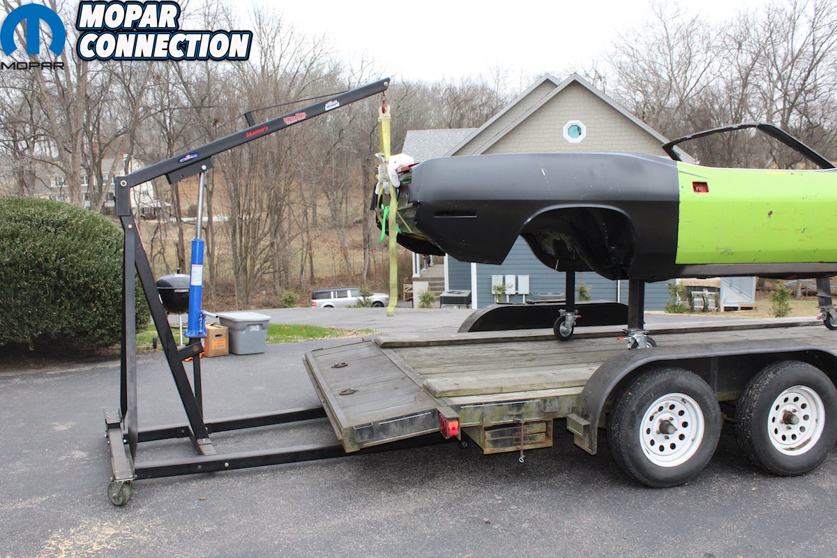 Above left: Six hours later and the “Comeback ‘Cuda” is back in Nashville. Lots of wind, interstate trucks, and by the time we left Cleveland, GA, it was dark. But with it strapped down well nothing moved. Above center: Without the suspension under the car it was necessary to use the cherry picker to unload the car at the house. One on the ground, and a smaller one on the trailer for the front, and in no time the car was off the trailer. Above right: The “Comeback ‘Cuda” is safe in the garage. The Hemi, K-member, front suspension, and 4-speed overdrive from Passon is already assembled. The doors and trunk lid are next on the list. They are headed for the blaster. With time to go over the car inch by inch now that it is home, the workmanship and the metal is perfect. Thank You, AMD Installation Center and Classic Muscle Metal.