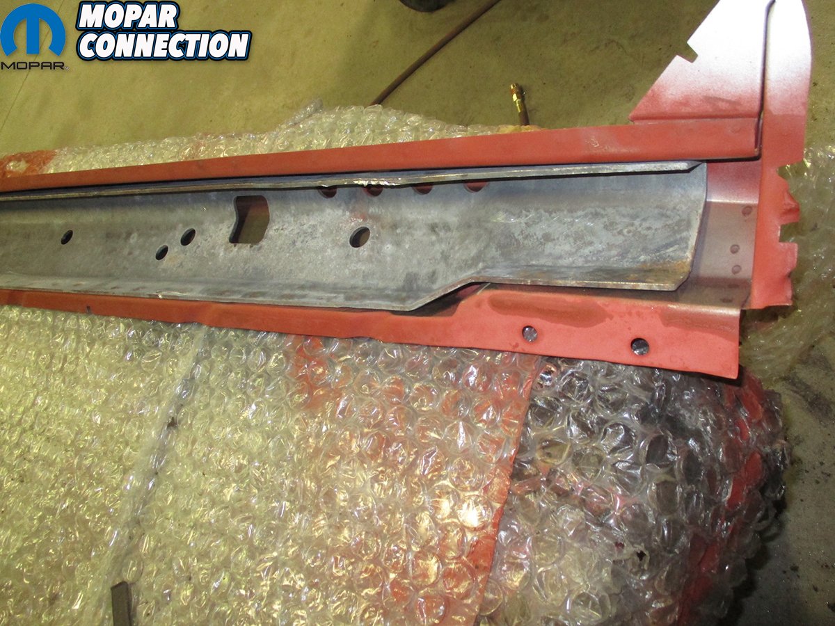 The AMD Installation Center was able to save most of the convertible-specific parts from our ‘Cuda: the front frame rails, firewall, windshield frame and A-pillars, heavy duty rocker beams, and the convertible top sub-structure with modified wheel well caps. The inner and outer wheel wells had to be modified for a convertible. The heavy rocker beams that hold a convertible together were bent during the wreck. However, Craig wasn’t going to let that slow him down. He fabricated a tool to use in his press and with a lot of patience and determination, massaged the originals back into shape.