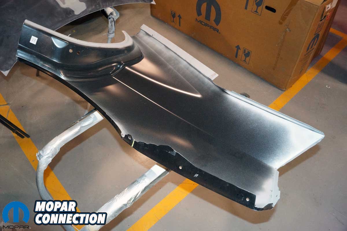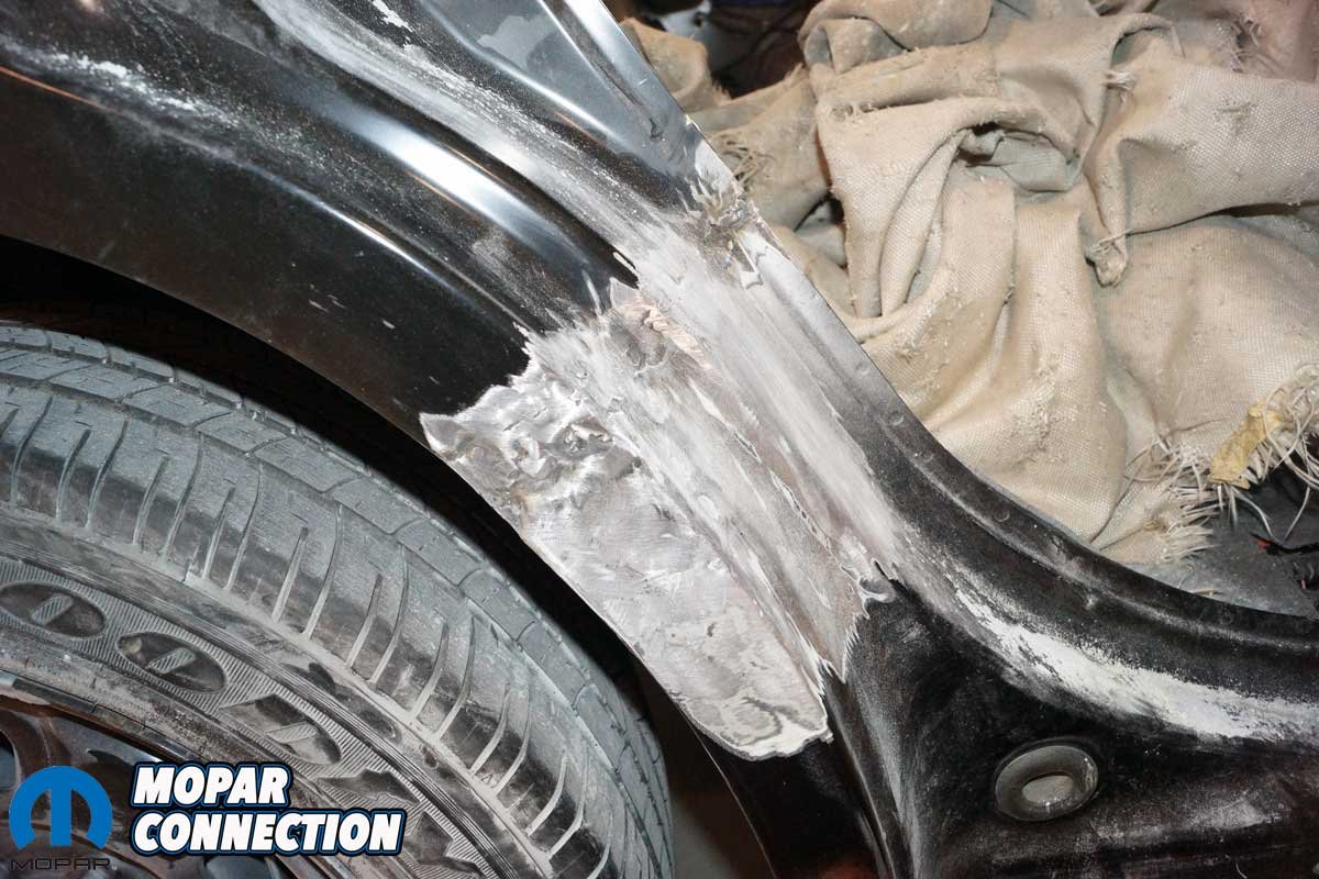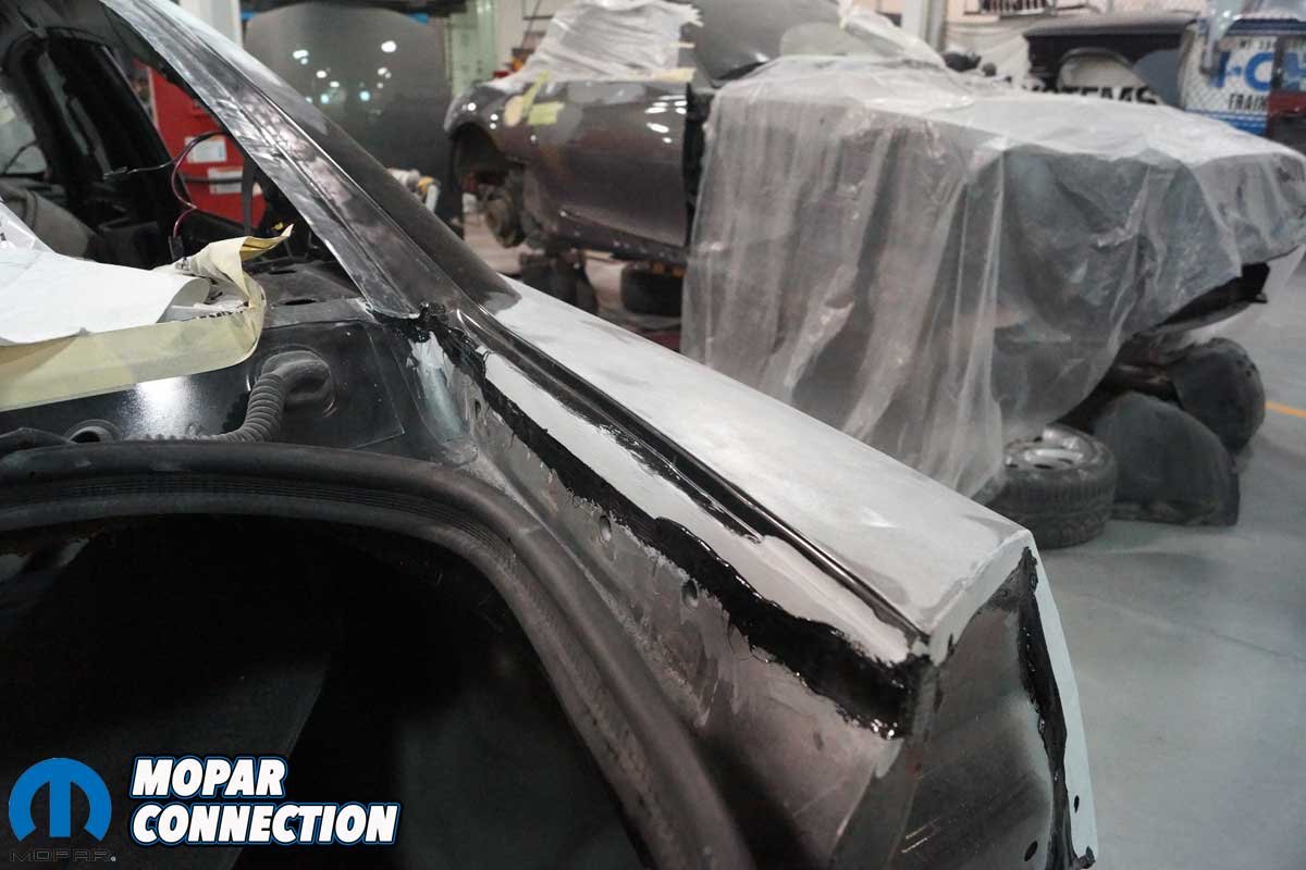 The inner perimeter of the quarter panel was sanded to remove the e-coat, and a layer of weld-thru primer was applied to the bare steel. The area of the Charger’s chassis where the quarter panel would be welded was also sanded, and weld-thru primer was applied to the surface. The weld-thru primer would not burn off when the heat from the welding process was applied. A weld-thru primer forms a high zinc area that reduces the possibility of future corrosion development.