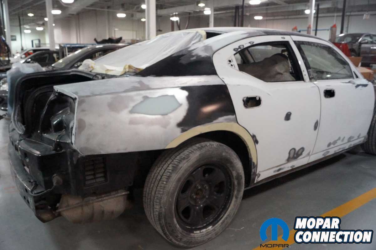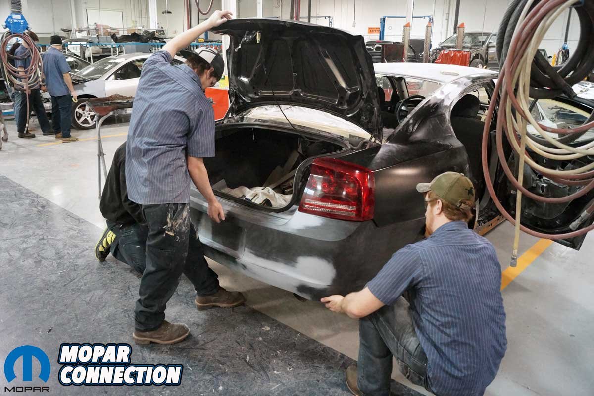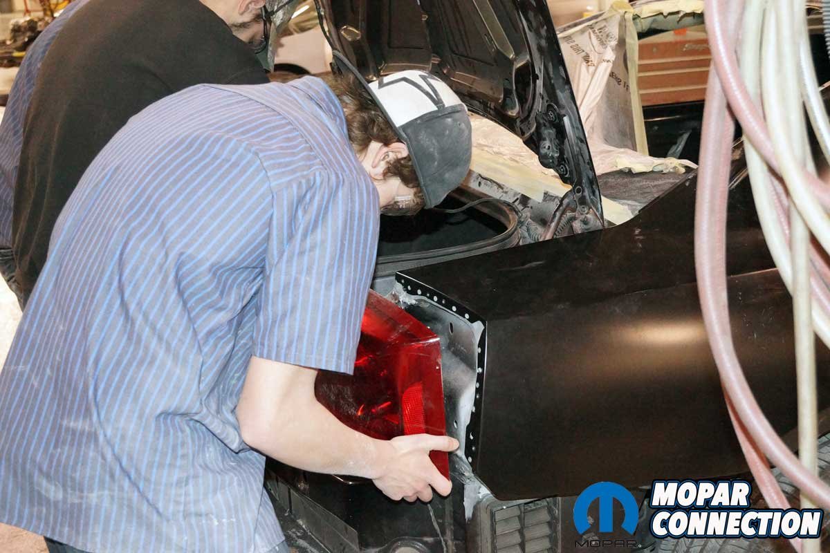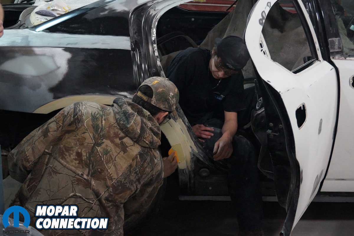 Above Left: The Penn College students added rust protection to the wheel well. The coverage should stop the chances of a reoccurrence of rust. Above Right: The new quarter panel was laid on the Charger. Getting the quarter panel lined up correctly took plenty of test fits. The trunk lid, bumper cover, and taillamp housing still had to be installed to verify the fit and the gaps.